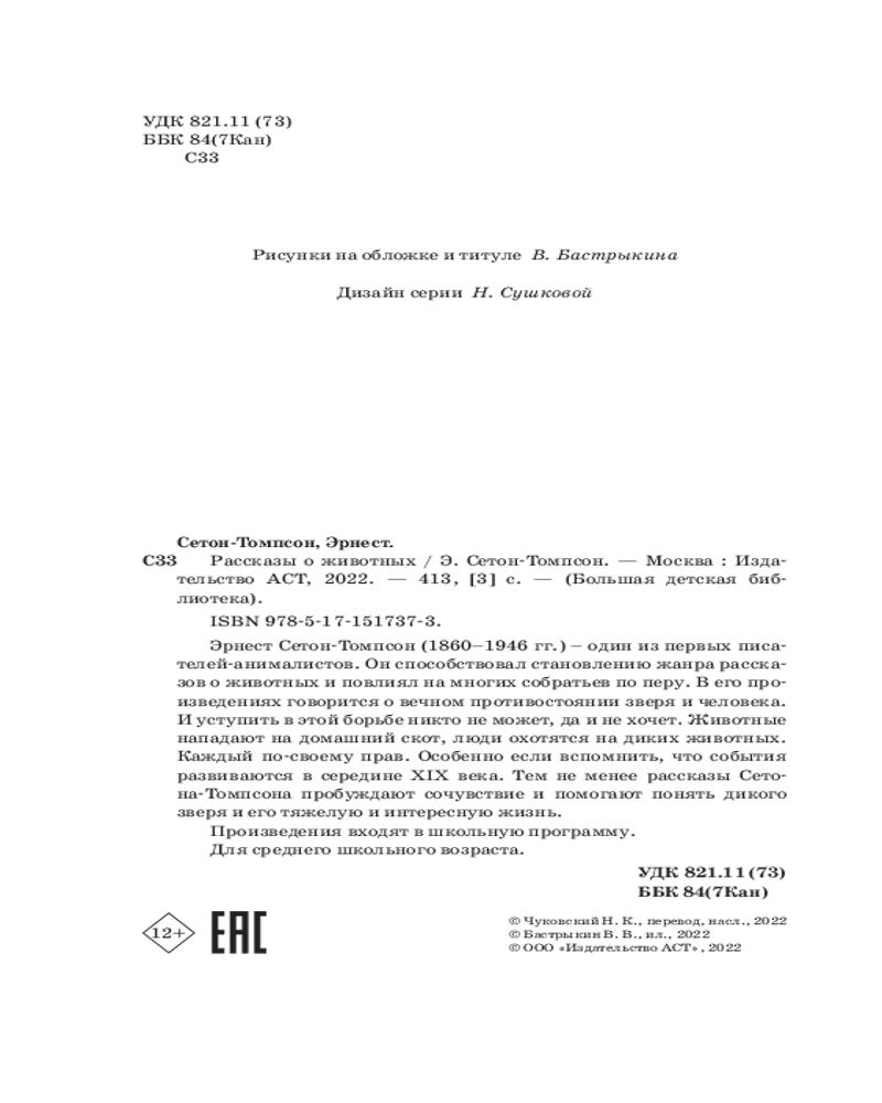 💳 Оплатить за товар можно при получении 🇰🇿 Есть бесплатная доставка по Казахстану от 1 дня 🎁 Копите бонусы с каждой покупки Серия: Большая детская библиотека Эрнест Сетон-Томпсон (1860-1946 гг.) — один из первых писателей-анималистов. Он поспособствовал становлению жанра рассказов о животных и повлиял на многих собратьев по перу. В его произведениях говорится о вечном противостоянии зверя и человека. И уступить в этой борьбе никто не может, да и не хочет. Животные нападают на домашний скот, люди охотятся на диких животных. Каждый по-своему прав. Особенно если вспомнить, что события развиваются в середине XIX века. Тем не менее рассказы Сетона-Томпсона пробуждают сочувствие и помогают понять дикого зверя и его тяжёлую и интересную жизнь. |