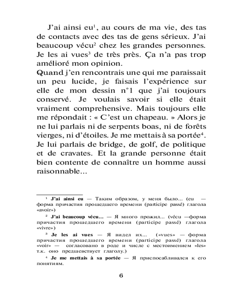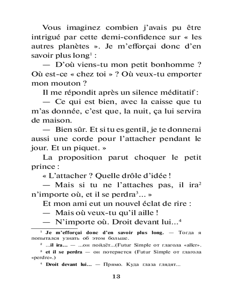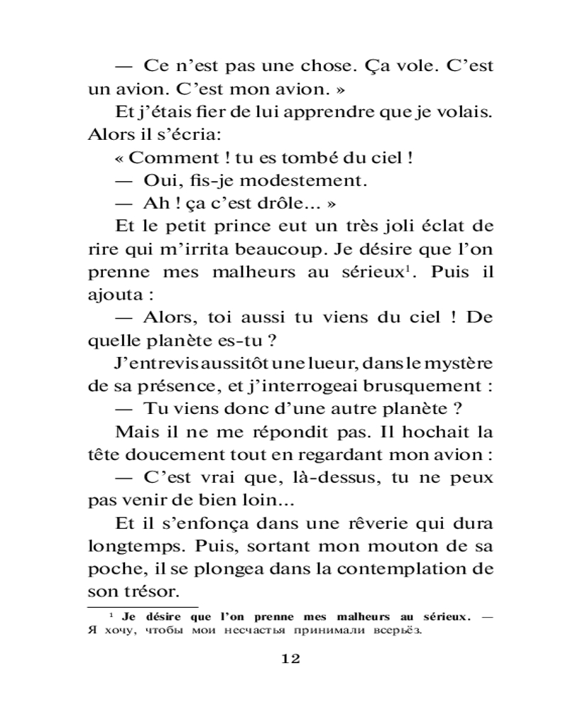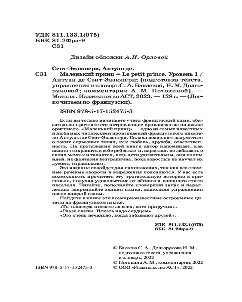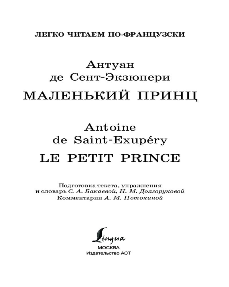Маленький принц. Le petit prince. Уровень 1В данный момент этот товар отсутствует в продаже. Возможно, у нас найдется аналогичный или похожий товар здесь. Серия: Легко читаем по-французски Если вы только начинаете учить французский язык, обязательно прочтите это потрясающее произведение на языке оригинала. «Маленький принц» — одно из самых известных и любимых читателями произведений французского писателя Антуана де Сент-Экзюпери. Сказка позволяет задуматься о таких серьезных темах, как любовь, дружба, ответственность. На протяжении всей книги автор напоминает, как важно «сохранить в себе ребенка» и, взрослея, не забывать о своих мечтах и талантах, ведь дети удивительны, они полны идей, их фантазия безгранична, пока взрослые не научат их думать «правильно». |