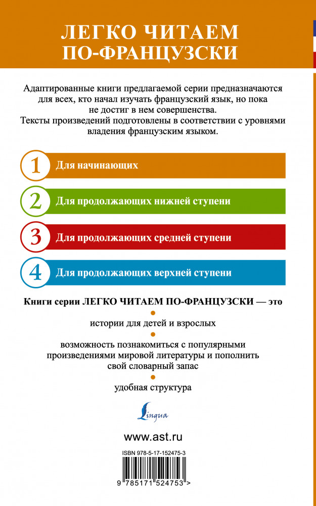 Отличная книга, которая даёт возможность начать читать, в адаптированном варианте, книге на французском языке!