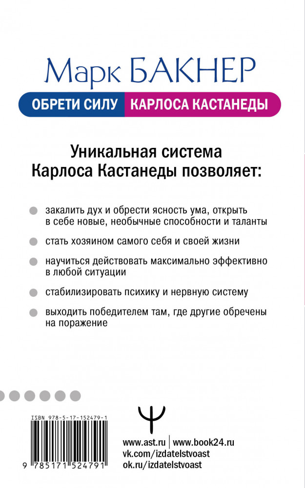 💳 Оплатить за товар можно при получении 🇰🇿 Есть бесплатная доставка по Казахстану от 1 дня 🎁 Копите бонусы с каждой покупки Серия: Самоучитель успеха Книга Марка Бакнера «Обрети силу Карлоса Кастанеды. 50 практик для развития сверхспособностей» — тренинг, построенный на основе уникальной методики легендарного Карлоса Кастанеды. Психологические практики позволяют глубже проникнуть в тайны учения Карлоса Кастанеды и применить эти приемы в реальной жизни. Уникальная система Карлоса Кастанеды позволяет: закалить дух и обрести ясность ума, открыть в себе новые, необычные способности и таланты; стать хозяином самого себя и своей жизни; научиться действовать максимально эффективно в любой ситуации; стабилизировать психику и нервную систему; выходить победителем там, где другие обречены на поражение! |