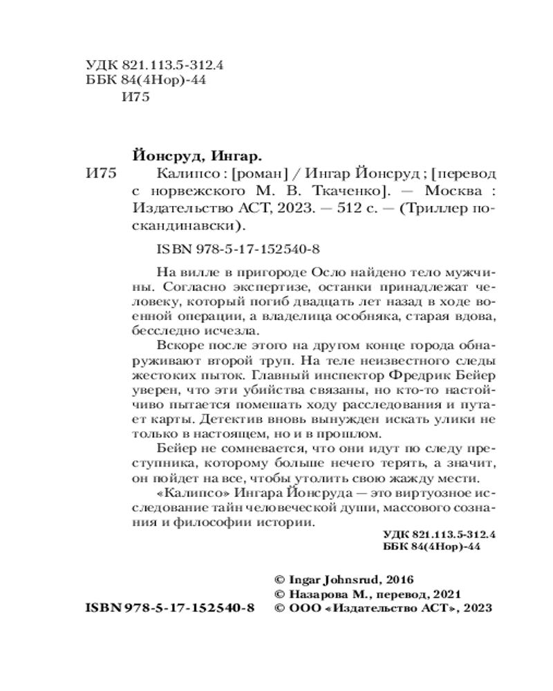 💳 Оплатить за товар можно при получении 🇰🇿 Есть бесплатная доставка по Казахстану от 1 дня 🎁 Копите бонусы с каждой покупки Серия: Триллер по-скандинавски(м) На вилле в пригороде Осло найдено тело мужчины. Согласно экспертизе, останки принадлежат человеку, который погиб двадцать лет назад в ходе военной операции, а владелица особняка, старая вдова, бесследно исчезла. |