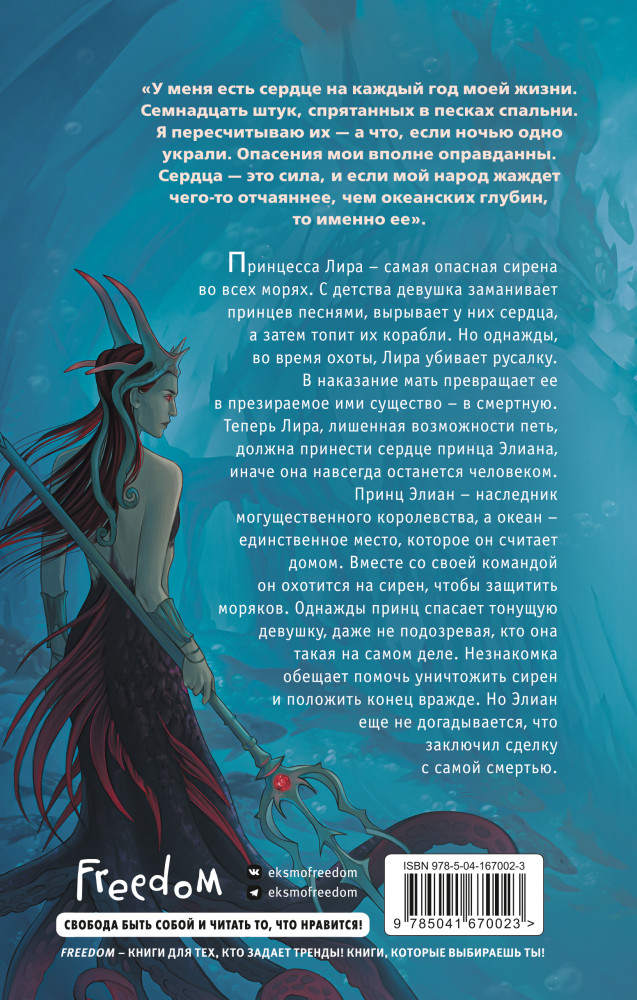 Уничтожить королевствоВ данный момент этот товар отсутствует в продаже. Возможно, у нас найдется аналогичный или похожий товар здесь. Серия: Young Adult. Пробуждение магии. Тёмное фэнтези Принцесса Лира — самая опасная сирена во всех морях. С детства девушка заманивает принцев песнями, вырывает у них сердца, а затем топит их корабли. Но однажды, во время охоты, Лира убивает русалку. В наказание мать превращает ее в презираемое ими существо — в смертную. Теперь Лира, лишенная возможности петь, должна принести сердце принца Элиана, иначе она навсегда останется человеком. |