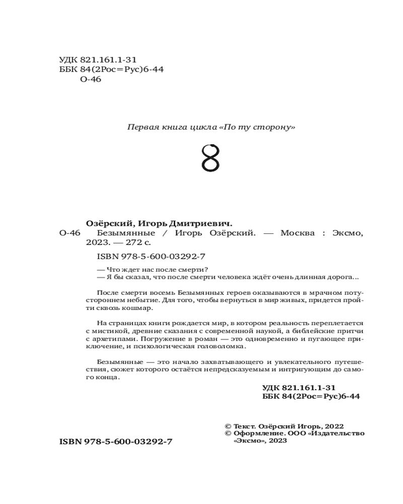Серия: По ту сторону. Современный мистический триллер «Безымянные» — философско-мистический триллер с элементами детектива и психологической головоломки. |