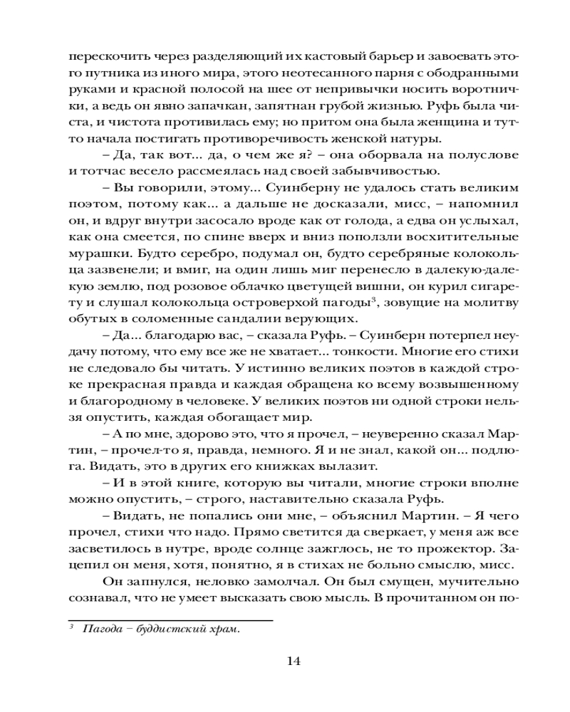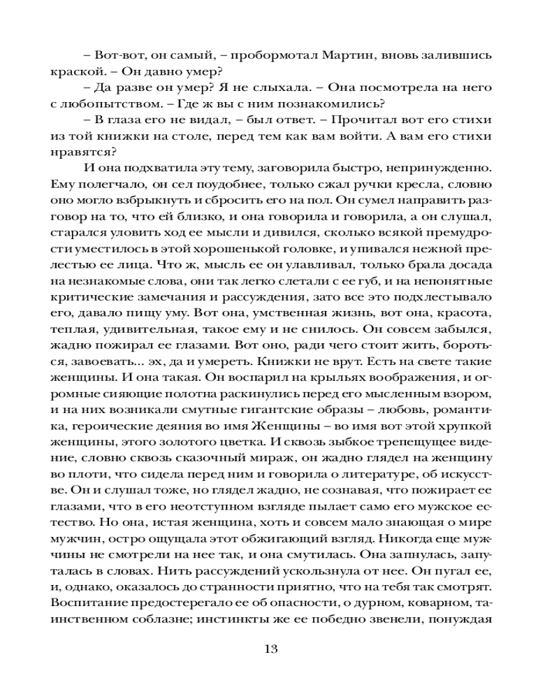 Это самое известное произведение Джека Лондона, оно о поиске места в жизни, муках творчества и муках любви, во многом автобиографичное. Произведение показывает, как человек с силой воли и упорством может многого достичь. Помогает быть сильным в любой ситуации, учит отстаивать свою позицию. Побуждает любить жизнь во всех ее мельчайших проявлениях и жадно хвататься за каждый ее миг.