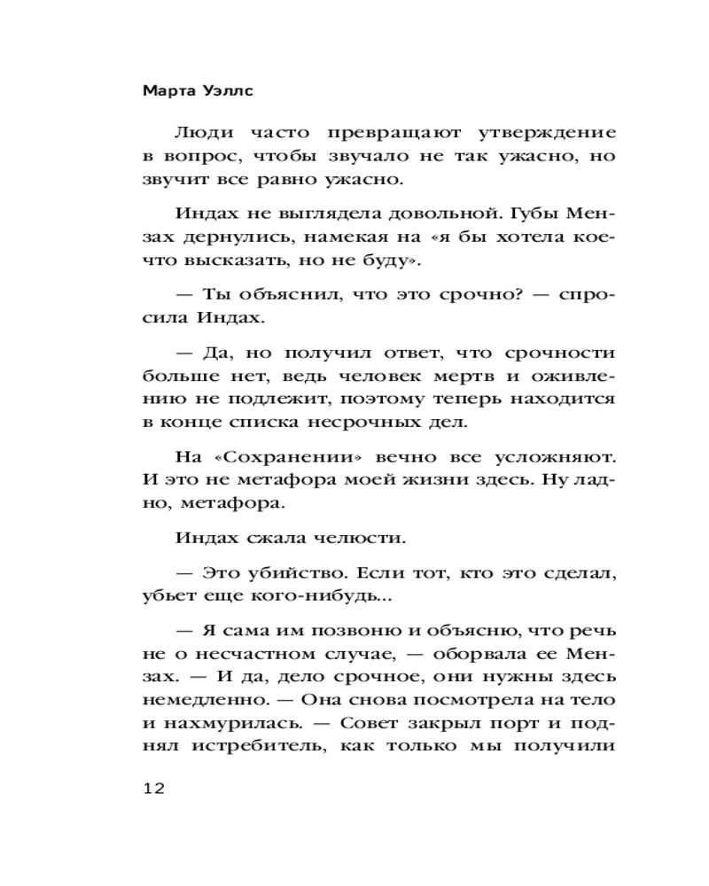| Марта Уэллс родилась в 1964 году в Fort Worth, в штате Техас. Окончила техасский университет со степенью бакалавра антропологии. За свою жизнь она успела открыть человеческое захоронение на археологических раскопках в пустыне на юго-востоке, посетить церемонию вуду в Новом Орлеане и разминуться на одну неделю с бывшим актером «Монти Пайтона» Майклом Палином на борту океанского лайнера «Куин Мэри». Ее первый роман «Стихия огня» был издан в твердой обложке в июле 1993 году. Второй ее роман —... |