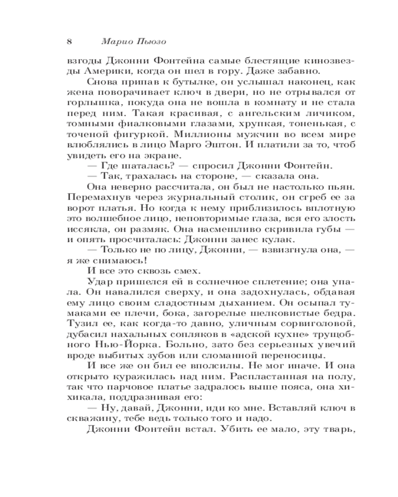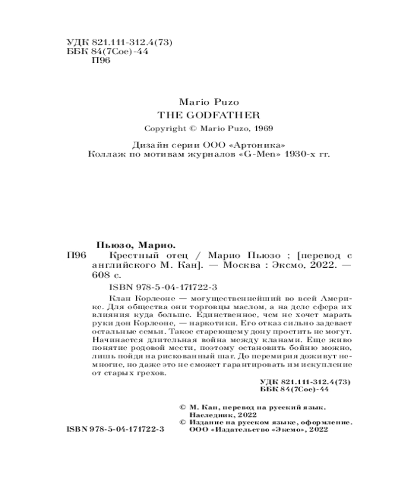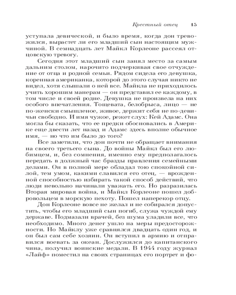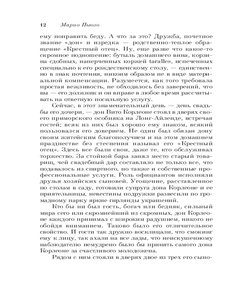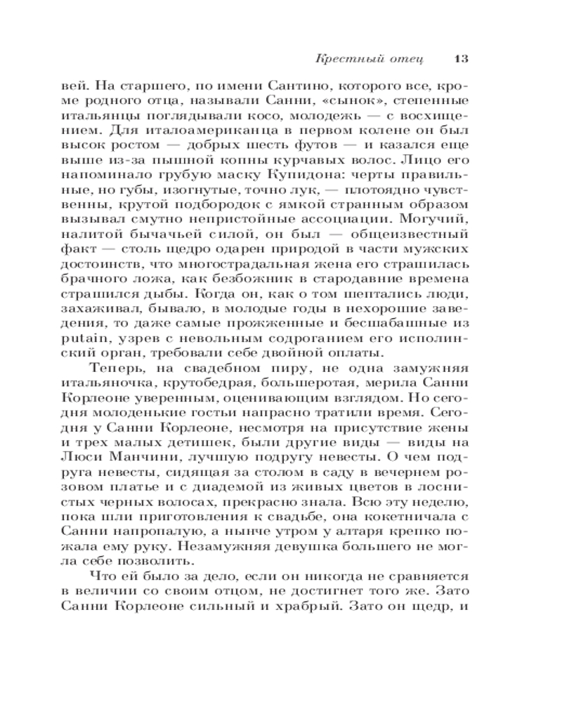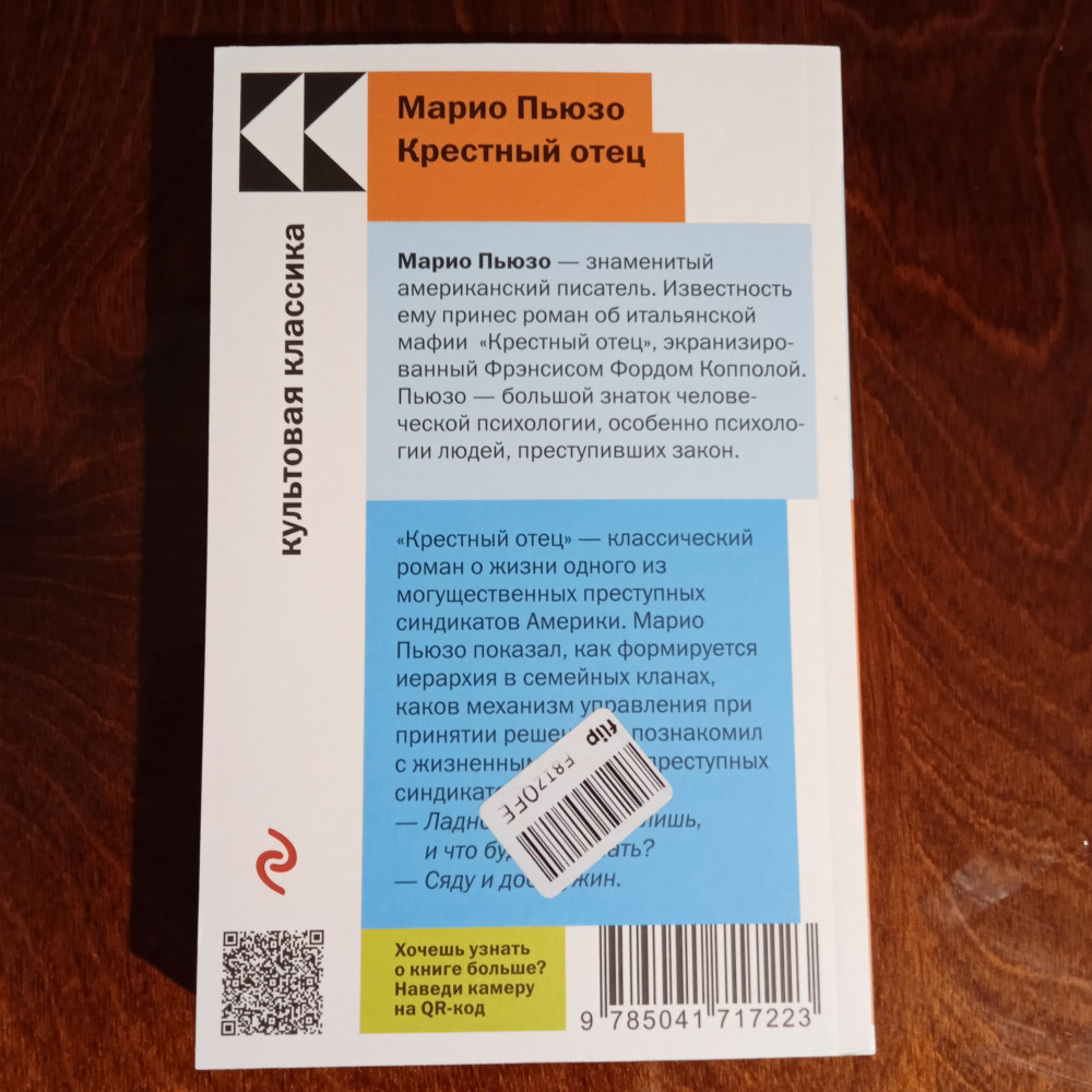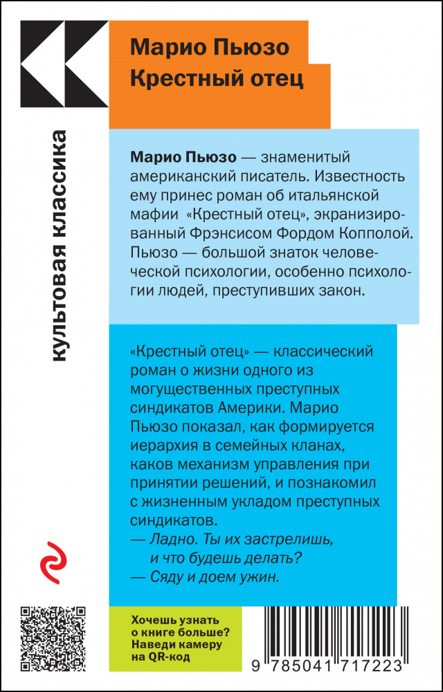 Крестный отецВ данный момент этот товар отсутствует в продаже. Возможно, у нас найдется аналогичный или похожий товар здесь. Серия: Культовая классика. Читаем главное «Крестный отец» — классический роман о жизни одного из могущественных преступных синдикатов Америки — мафиозного клана дона Корлеоне. Написанная с потрясающей достоверностью книга позволяет читателю без риска для жизни заглянуть в святая святых мафии. |