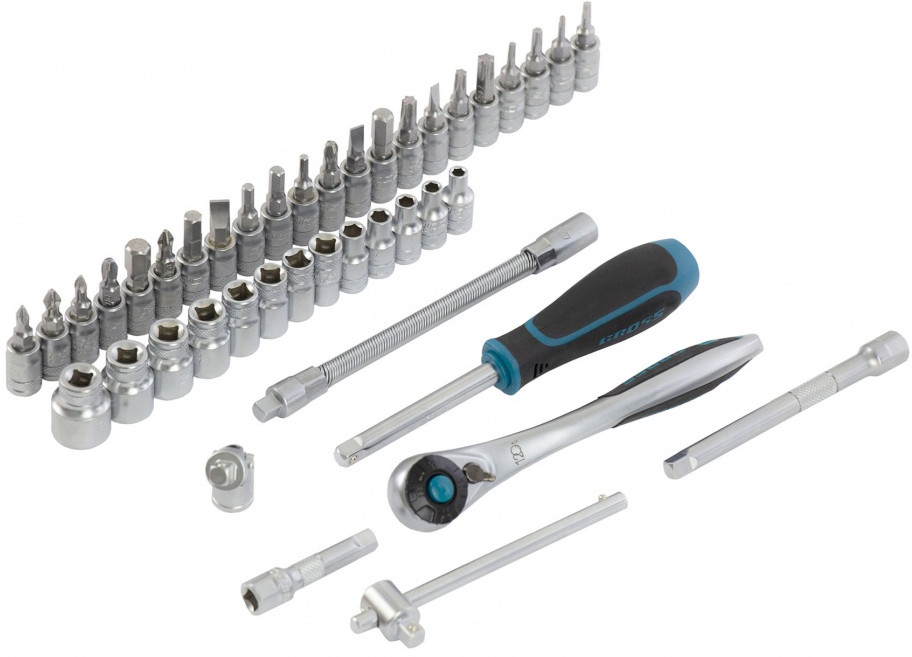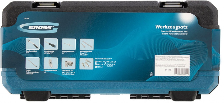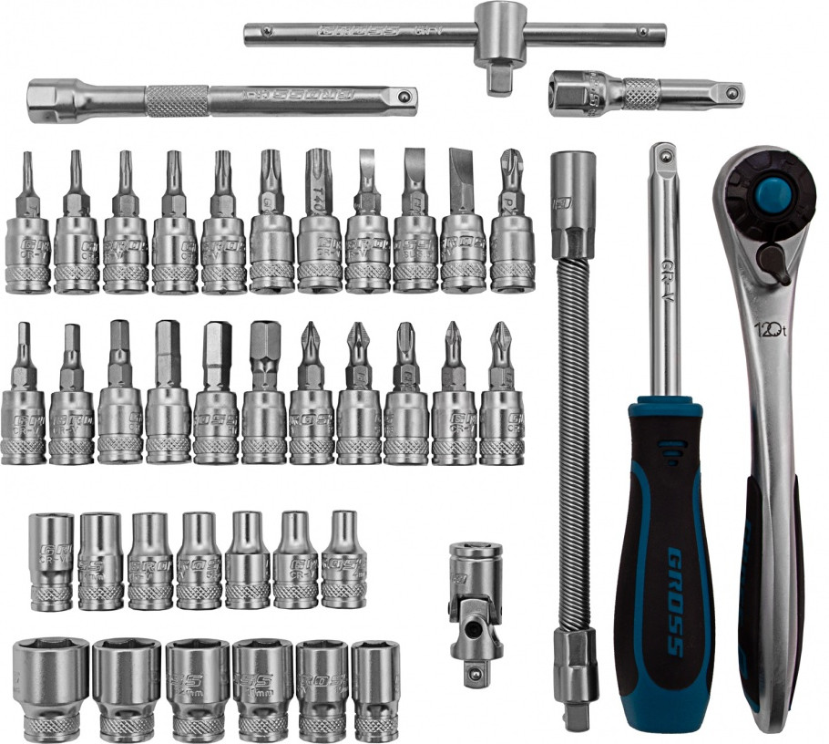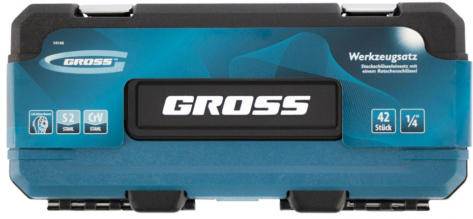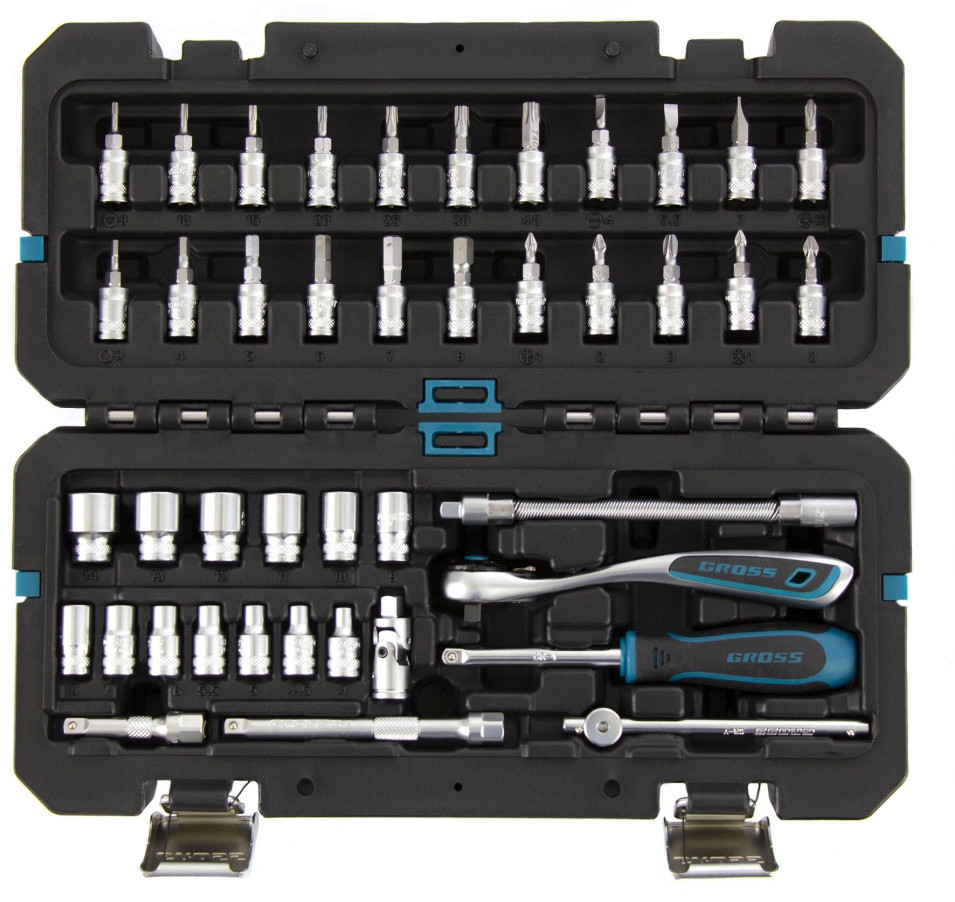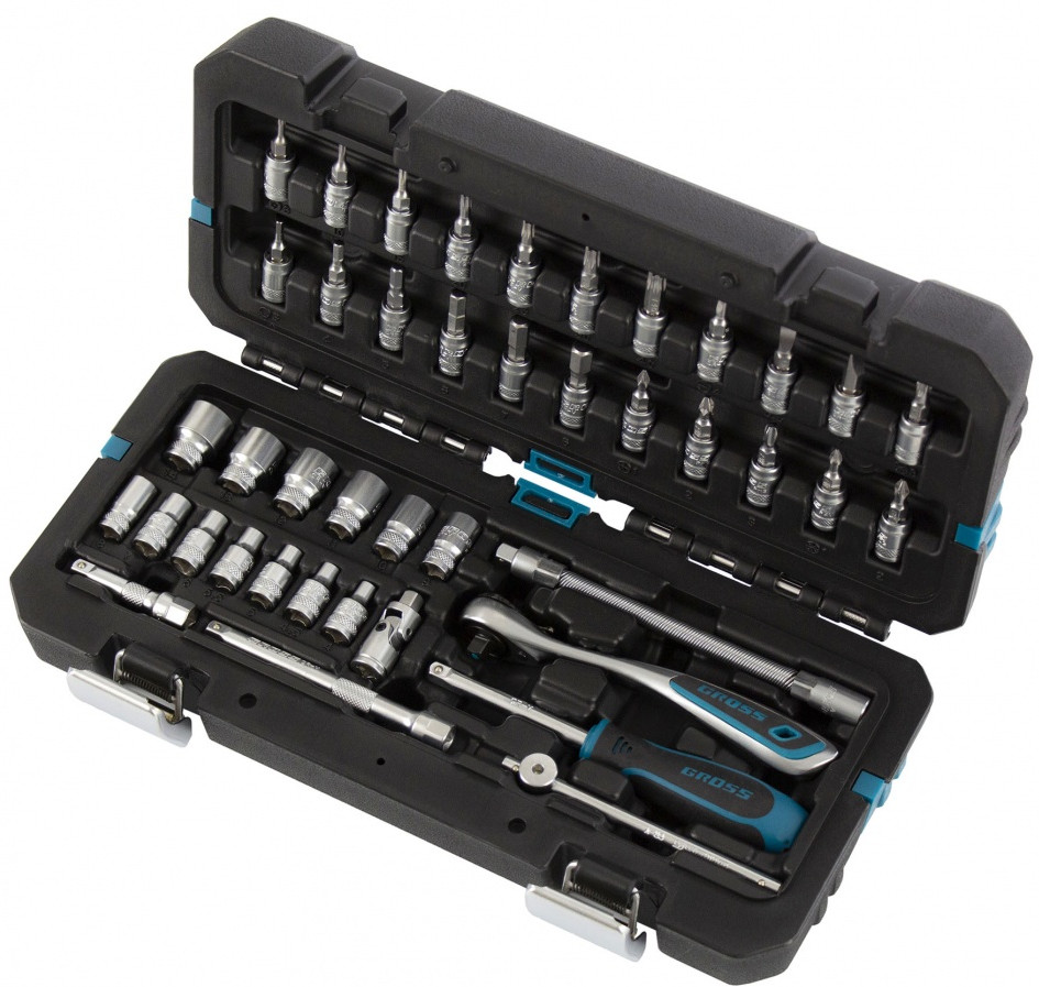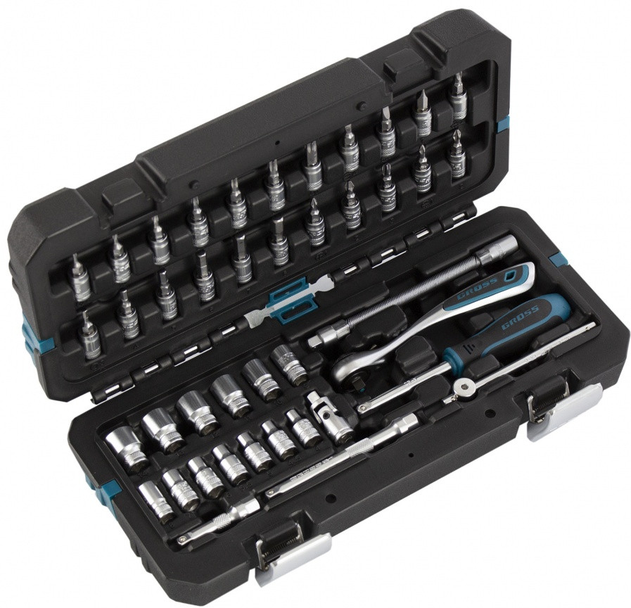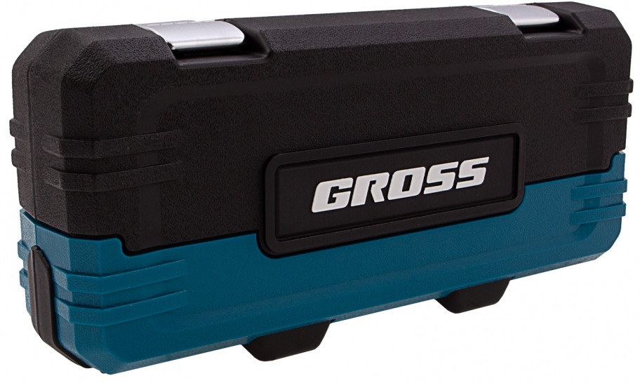 Набор инструментов Gross предназначен для монтажа и демонтажа резьбовых соединений. Кардан, вороток и совместимые с гаечным ключом удлинители облегчают работу с труднодоступными крепежами. Комплект упакован в кейс из твердого ударопрочного пластика с надежными металлическими замками, в котором инструменты удобно хранить и перевозить. Набор используется для ремонта автомобилей в гараже или условиях автосервиса.