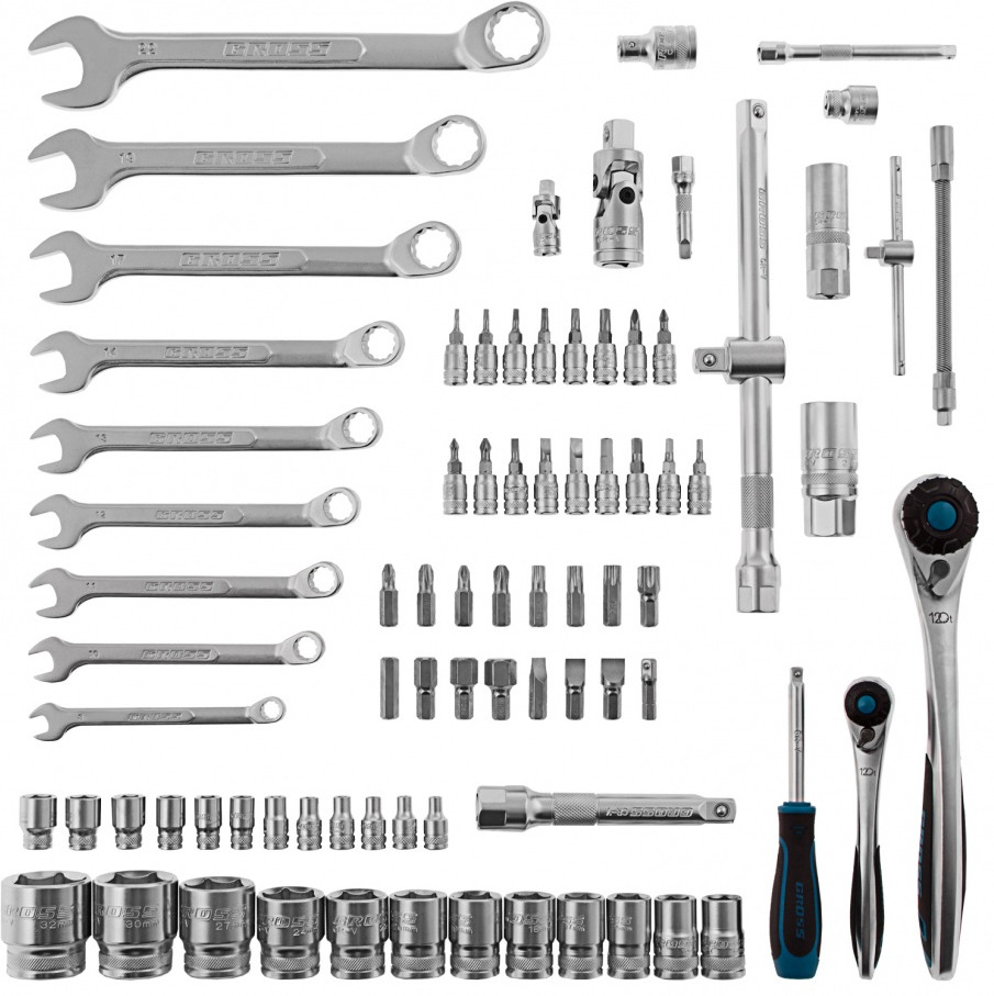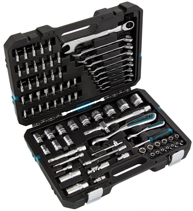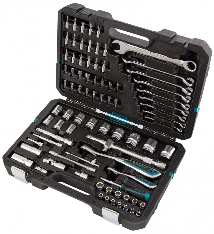 Набор инструментов включает 82 предмета, в том числе ключи-трещотки со 120 зубьями, и предназначен для работы в гараже, а также домашнего ремонта. В комплекте инструменты для монтажа и демонтажа резьбовых соединений. Вороток, удлинители и карданные шарниры облегчают манипуляции в стесненных условиях. Для хранения и транспортировки предусмотрен кейс из ударопрочного пластика с надежными металлическими замками.
