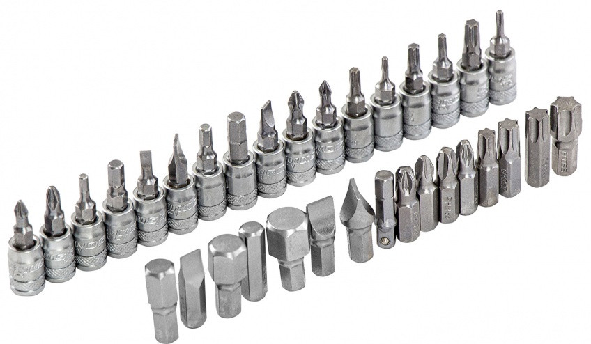 • биты с торцевыми головками 1/4″: H3, H4, H5, H6, T8, T10, T15, T20, T25, T30, SL4, SL5,5, SL7, PH1, PH2, PZ1, PZ2;