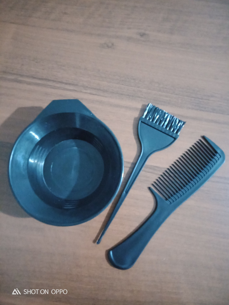К сожалению когда я дошла до набора, сама чашка нормальная, не маленькая, расчёска с щёткой для покраски волос тоже нормальная, а вот сама расчёска после окрашивание волос к которой рекомендуется после расчесать волосы, чтобы краска легла равномерно, сломалась. Видимо она рассчитана для тех, у кого уж совсем тонкие волосы. Хотя расчёска должна быть рассчитана для любых типов волос. Благо под рукой оказалась нормальная расчёска.