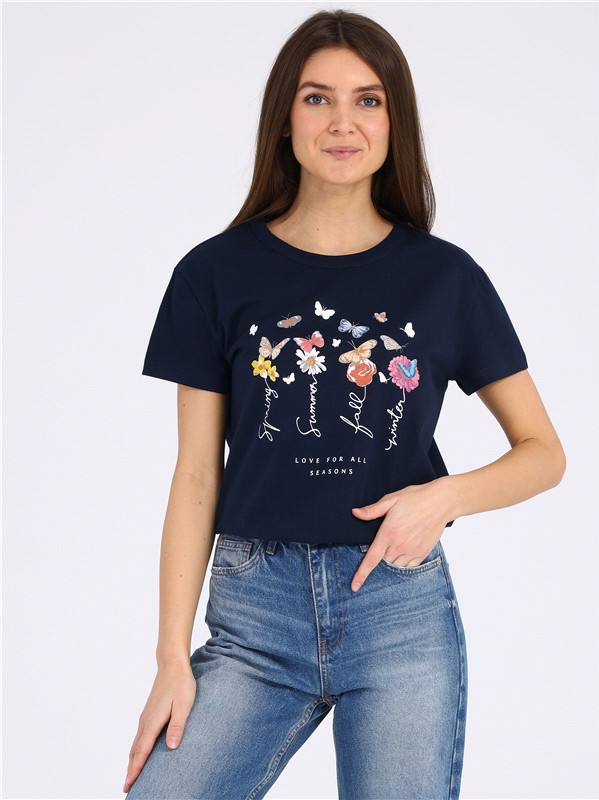 Футболка выполнена из легкого хлопкового полотна. Изделие свободного покроя с короткими рукавами и округлым вырезом горловины, украшено дизайнерским принтом.