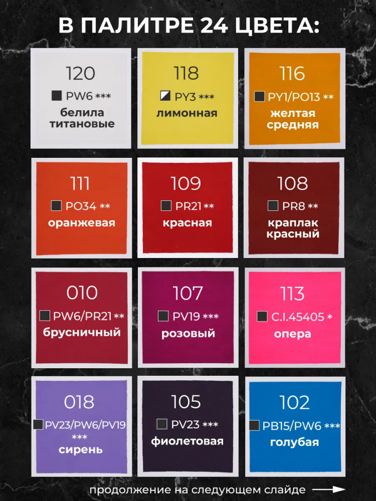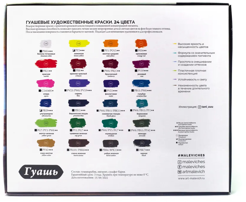 💳 Оплатить за товар можно при получении 🇰🇿 Есть бесплатная доставка по Казахстану от 1 дня 🎁 Копите бонусы с каждой покупки Гуашь художественная «Малевичъ» — водорастворимая, комфортная для работы краска с приятной кремовой консистенцией и повышенной концентрацией пигмента. Высокая кроющая способность позволяет наносить четкие мелкие непрозрачные детали светлых тонов на фон темного оттенка. Рисунки гуашью после высыхания приобретают бархатисто-матовую поверхность. Краска быстро сохнет, надолго сохраняет яркий и насыщенный цвет. Набор подходит как для начинающих, так и для профессиональных иллюстраторов. Гуашь изготовлена на основе растительного клея-гуммиарабика и пигментов высокого класса. |