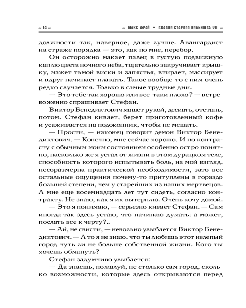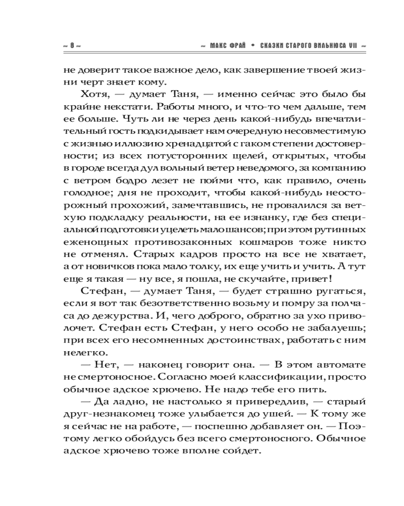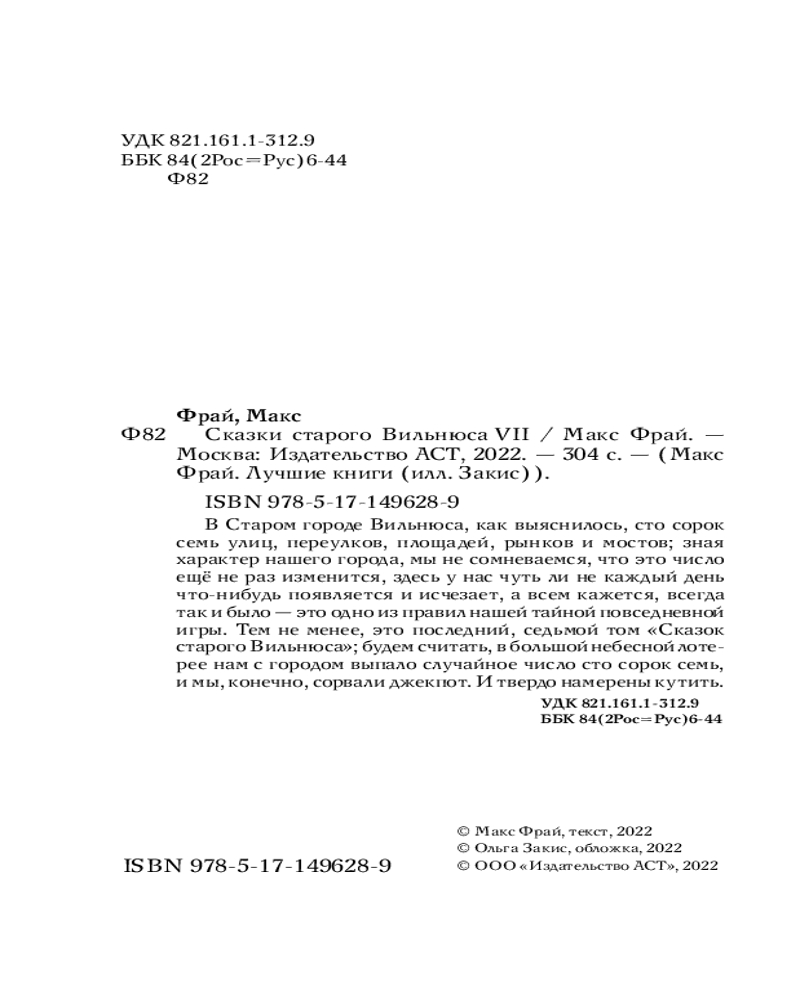 💳 Оплатить за товар можно при получении 🇰🇿 Есть бесплатная доставка по Казахстану от 1 дня 🎁 Копите бонусы с каждой покупки Серия: Макс Фрай. Лучшие книги (илл. Закис) В Старом городе Вильнюса, как выяснилось, сто сорок семь улиц, переулков, площадей, рынков и мостов; зная характер нашего города, мы не сомневаемся, что это число ещё не раз изменится, здесь у нас чуть ли не каждый день что-нибудь появляется и исчезает, а всем кажется, всегда так и было — это одно из правил нашей тайной повседневной игры. Тем не менее, это последний, седьмой том «Сказок старого Вильнюса»; будем считать, в большой небесной лотерее нам с городом выпало случайное число сто сорок семь, и мы, конечно, сорвали джекпот. И твердо намерены кутить. |