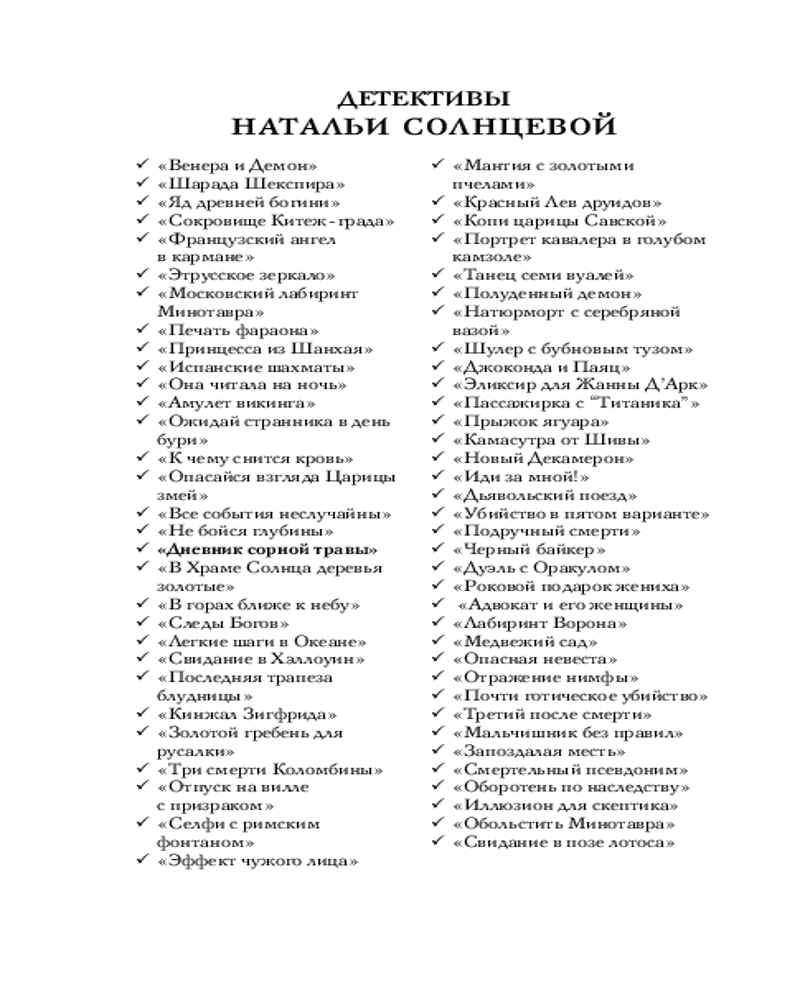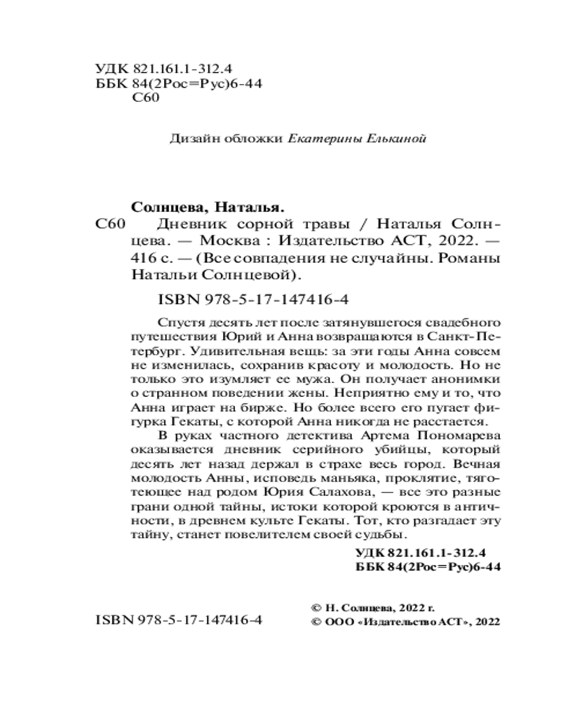 💳 Оплатить за товар можно при получении 🇰🇿 Есть бесплатная доставка по Казахстану от 1 дня 🎁 Копите бонусы с каждой покупки Серия: Все совпаденья не случайны. Романы Натальи Солнцевой Спустя десять лет после затянувшегося свадебного путешествия Юрий и Анна возвращаются в Санкт-Петербург. Удивительная вещь: за эти годы Анна совсем не изменилась, сохранив красоту и молодость. Но не только это изумляет ее мужа. Он получает анонимки о странном поведении жены. Неприятно ему и то, что Анна играет на бирже. Но более всего его пугает фигурка Гекаты, с которой Анна никогда не расстается. |