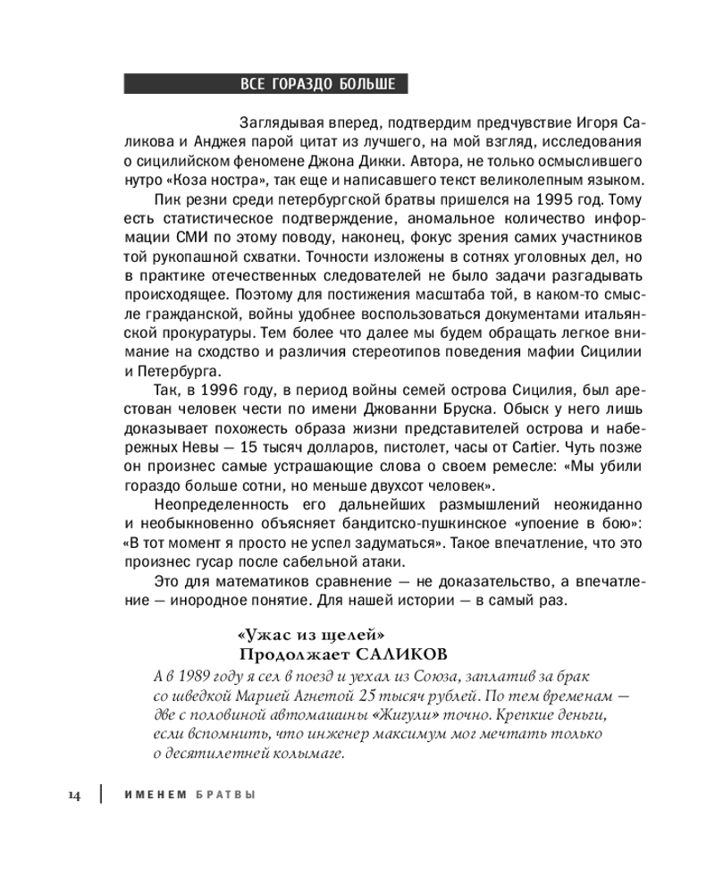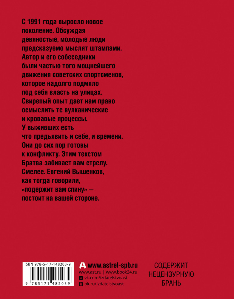 Именем братвы. Происхождение гангстера от спортсмена, или 30 лет со смерти СССРВ данный момент этот товар отсутствует в продаже. Возможно, у нас найдется аналогичный или похожий товар здесь. Серия: История российской мафии С 1991 года выросло новое поколение. Обсуждая девяностые, молодые люди предсказуемо мыслят штампами. Автор и его собеседники были частью того мощнейшего движения советских спортсменов, которое надолго подмяло под себя власть на улицах. Свирепый опыт дает нам право осмыслить те вулканические и кровавые процессы. У выживших есть что предъявить и себе, и времени. Они до сих пор готовы к конфликту. Этим текстом Братва забивает вам стрелу. Смелее. Евгений Вышенков, как тогда говорили, «подержит вам спину» — постоит на вашей стороне. |