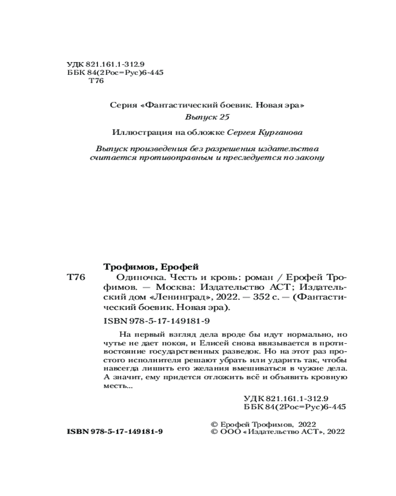 Одиночка. Честь и кровьВ данный момент этот товар отсутствует в продаже. Возможно, у нас найдется аналогичный или похожий товар здесь. Серия: Фантастический боевик. Новая эра На первый взгляд дела вроде бы идут нормально, но чутье не дает покоя, и Елисей снова ввязывается в противостояние государственных разведок. Но на этот раз простого исполнителя решают убрать или ударить так, чтобы навсегда лишить его желания вмешиваться в чужие дела. А значит, ему придется отложить всё и объявить кровную месть... |