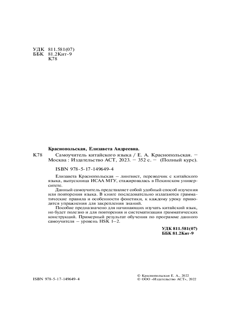 💳 Оплатить за товар можно при получении 🇰🇿 Есть бесплатная доставка по Казахстану от 1 дня 🎁 Копите бонусы с каждой покупки Серия: Полный курс Елизавета Краснопольская — лингвист, переводчик с китайского языка, выпускница ИСАА МГУ, стажировалась в Пекинском университете. Данный самоучитель представляет собой удобный способ изучения или повторения языка. В книге последовательно излагаются грамматические правила и особенности фонетики, к каждому уроку приводятся упражнения для закрепления знаний. Учебник предназначен для начинающих изучать китайский язык, но будет полезен и в качестве пособия для повторения и систематизации грамматических конструкций. Примерный результат обучения по программе данного самоучителя — уровень HSK 1–2. |