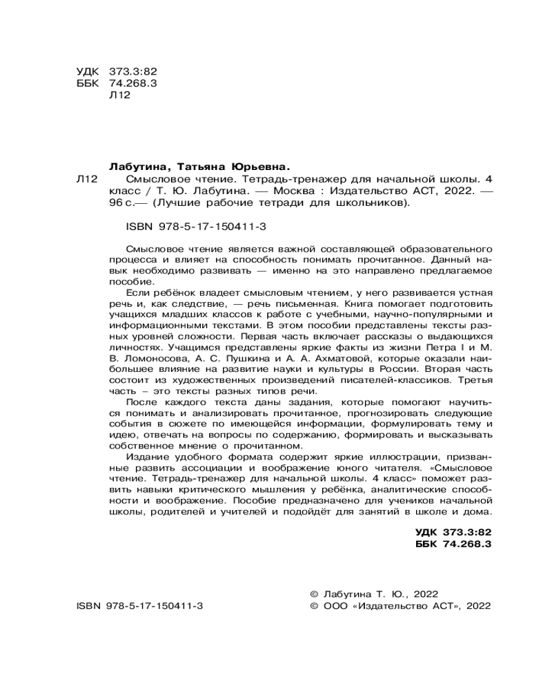 💳 Оплатить за товар можно при получении 🇰🇿 Есть бесплатная доставка по Казахстану от 1 дня 🎁 Копите бонусы с каждой покупки Серия: Лучшие рабочие тетради для школьников Смысловое чтение является важной составляющей образовательного процесса и влияет на способность понимать прочитанное. Данный навык необходимо развивать — именно на это направлено предлагаемое пособие. |