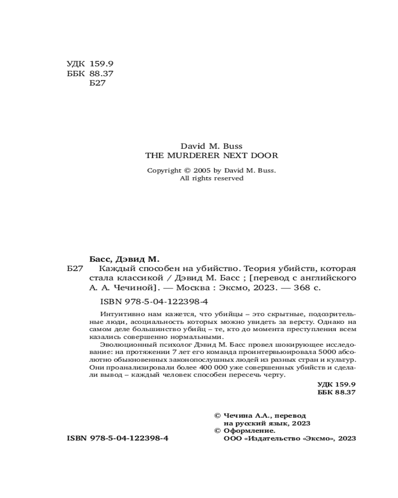 💳 Оплатить за товар можно при получении 🇰🇿 Есть бесплатная доставка по Казахстану от 1 дня 🎁 Копите бонусы с каждой покупки Серия: Profiling. Искусство вычислять преступников Интуитивно нам кажется, что убийцы — это скрытные, подозрительные люди, асоциальность которых можно увидеть за версту. Однако на самом деле большинство убийц — те, кто до момента преступления всем казались совершенно нормальными. |