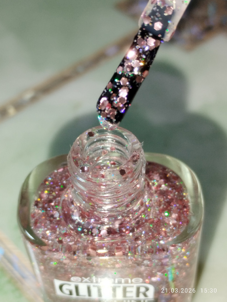 Лак ранее открывали, так как есть засохшие блёстки на горлышке бутылка. С трудом открыла крышку.