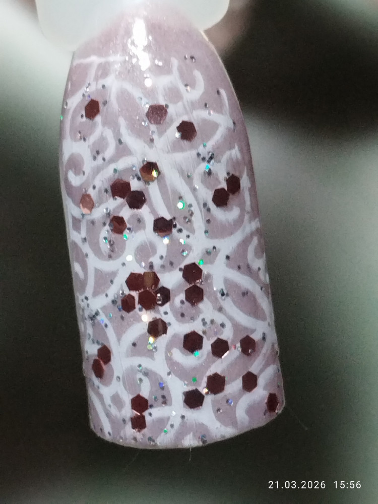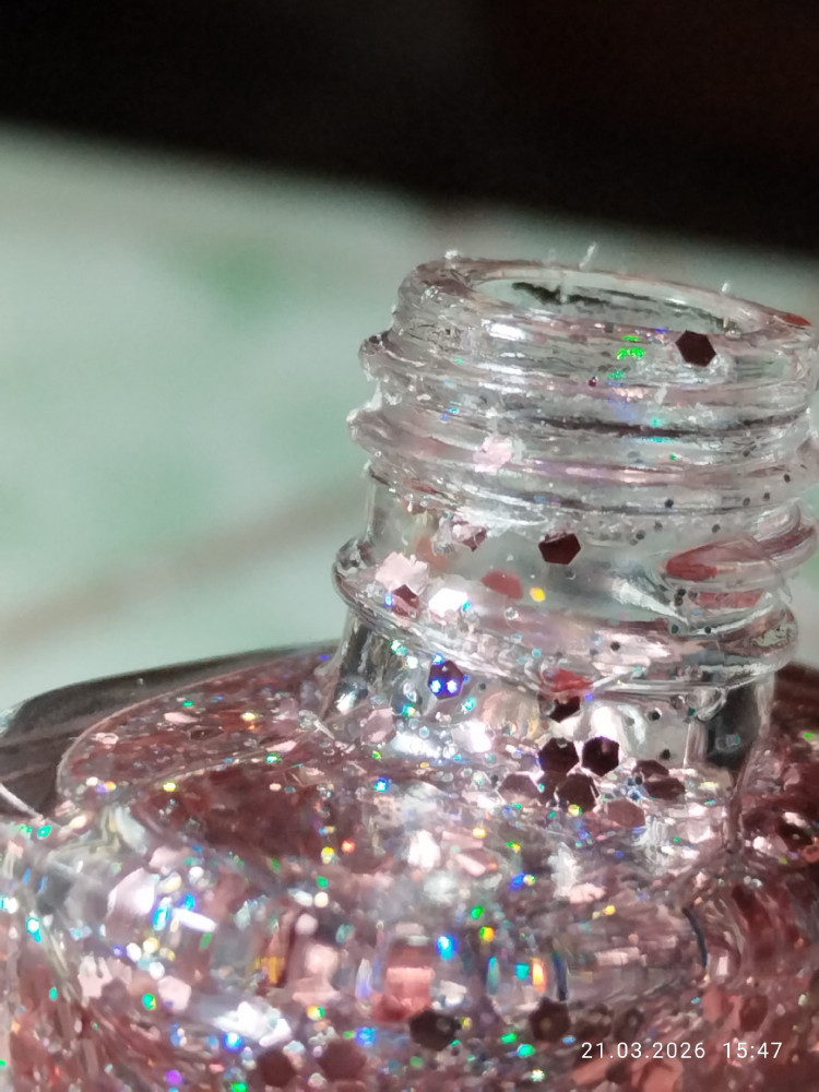 Красивый оттенок, хороший срок годности, высыхает быстро. Мелкий разноцветный глиттер.