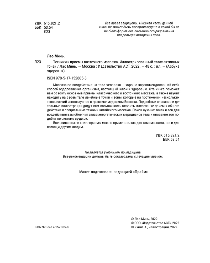 💳 Оплатить за товар можно при получении 🇰🇿 Есть бесплатная доставка по Казахстану от 1 дня 🎁 Копите бонусы с каждой покупки Серия: Азбука здоровья Книга специалиста по восточным оздоровительным практикам Лао Миня «Техники и приемы восточного массажа. Иллюстрированный атлас активных точек» — это подробное руководство по массажному воздействию с детальным разбором классических приемов и специальных техник китайского массажа. Цветной атлас энергетических меридианов и зон подобия по системе су-джок поможет вам научиться правильно оказывать воздействие на биологически активные точки и улучшить работу всех систем организма, укрепить его защиту, ускорить выздоровление от самых разных заболеваний и облегчить состояние при хронических недомоганиях. |