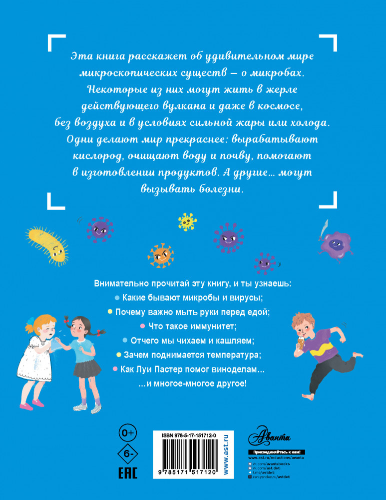 Почему мы болеем?Анастасия Анатольевна Мещерякова В данный момент этот товар отсутствует в продаже. Возможно, у нас найдется аналогичный или похожий товар здесь. Серия: Самые лучшие почемучкины книжки Книга популяризатора науки Анастасии Мещеряковой «Почему мы болеем?» расскажет об удивительном мире микроскопических существ — о микробах и вирусах, которые окружают нас повсюду. Некоторые микробы оказались полезными, а некоторые — то и дело стараются навредить. К счастью, наш организм обладает совершенной системой защиты от болезнетворных микробов и вирусов — иммунитетом. Зачем вообще нужны бактерии и вирусы, как они устроены, каким образом организм борется с ними, для чего мы кашляем, почему повышается температура — ответы на эти и многие другие вопросы ты найдёшь в нашей книге. |