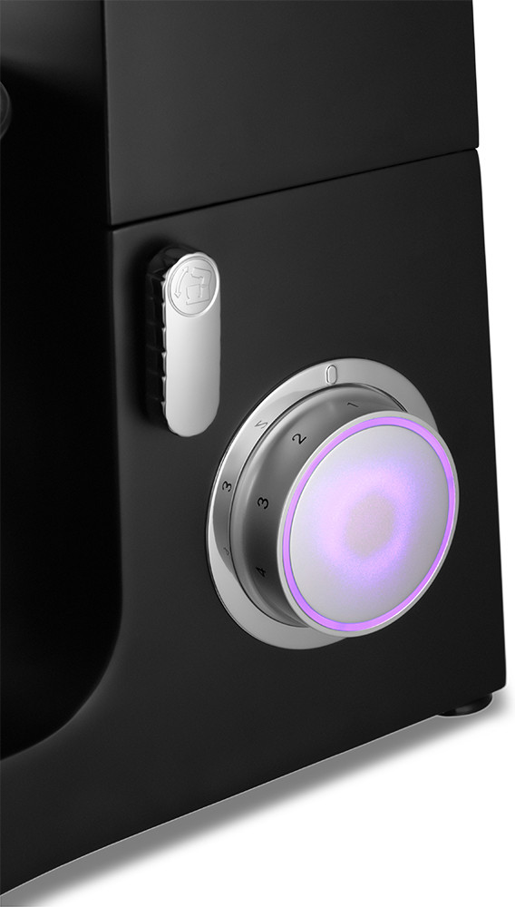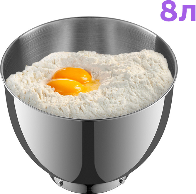 Миксер оснащён большой чашей ёмкостью 8 литров. Она прочная, изготовлена из нержавеющей стали, и в ней можно смешивать даже горячие ингредиенты.