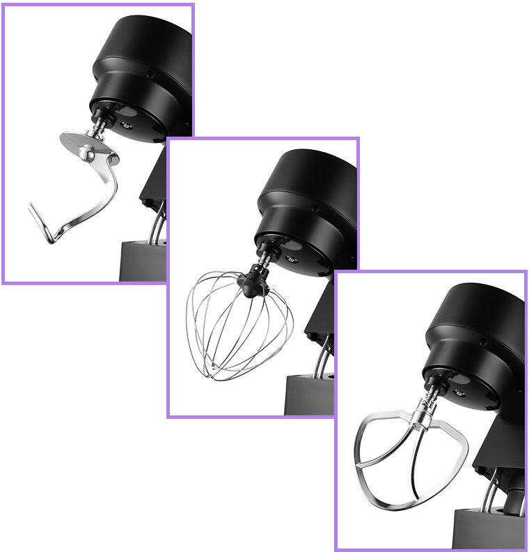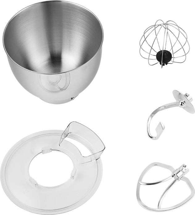 В комплекте идут венчик для взбивания, крюк для замеса крутого теста, насадка для смешивания и приготовления пюре. Форма насадок и чаши подобраны так, что почти при любом количестве продуктов насадка качественно их перемешает.