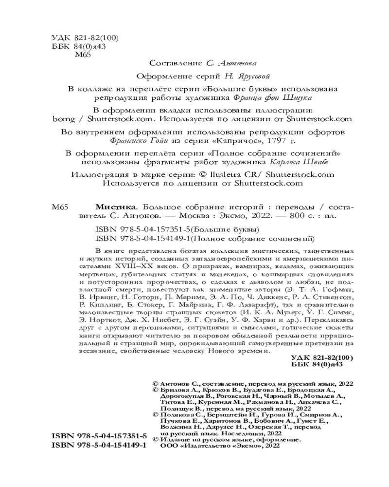 💳 Оплатить за товар можно при получении 🇰🇿 Есть бесплатная доставка по Казахстану от 1 дня 🎁 Копите бонусы с каждой покупки Серия: Полное собрание сочинений (новое оформление) В книге представлена богатая коллекция мистических, таинственных и жутких историй, созданных западноевропейскими и американскими писателями XVIII-XX веков. О призраках, вампирах, ведьмах, оживающих мертвецах, губительных статуях и манекенах, о кошмарных сновидениях и потусторонних пророчествах, о сделках с дьяволом и любви, не подвластной смерти, повествуют как знаменитые авторы (Э. Т. А. Гофман, В. Ирвинг, Н. Готорн, П. Мериме, Э. А. По, Г. Мелвилл, Ч. Диккенс, Р. Л. Стивенсон, Р. Киплинг, Б. Стокер, Г. Майринк, Г. Ф. Лавкрафт), так и сравнительно малоизвестные творцы страшных сюжетов (И. К. А. Музеус, У. Г. Симмс, Э. Норткот, Дж. Х. Нисбет, Э. Г. Суэйн, У. Ф. Харви и др.). |