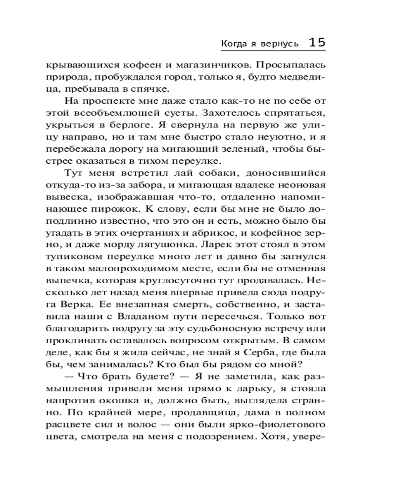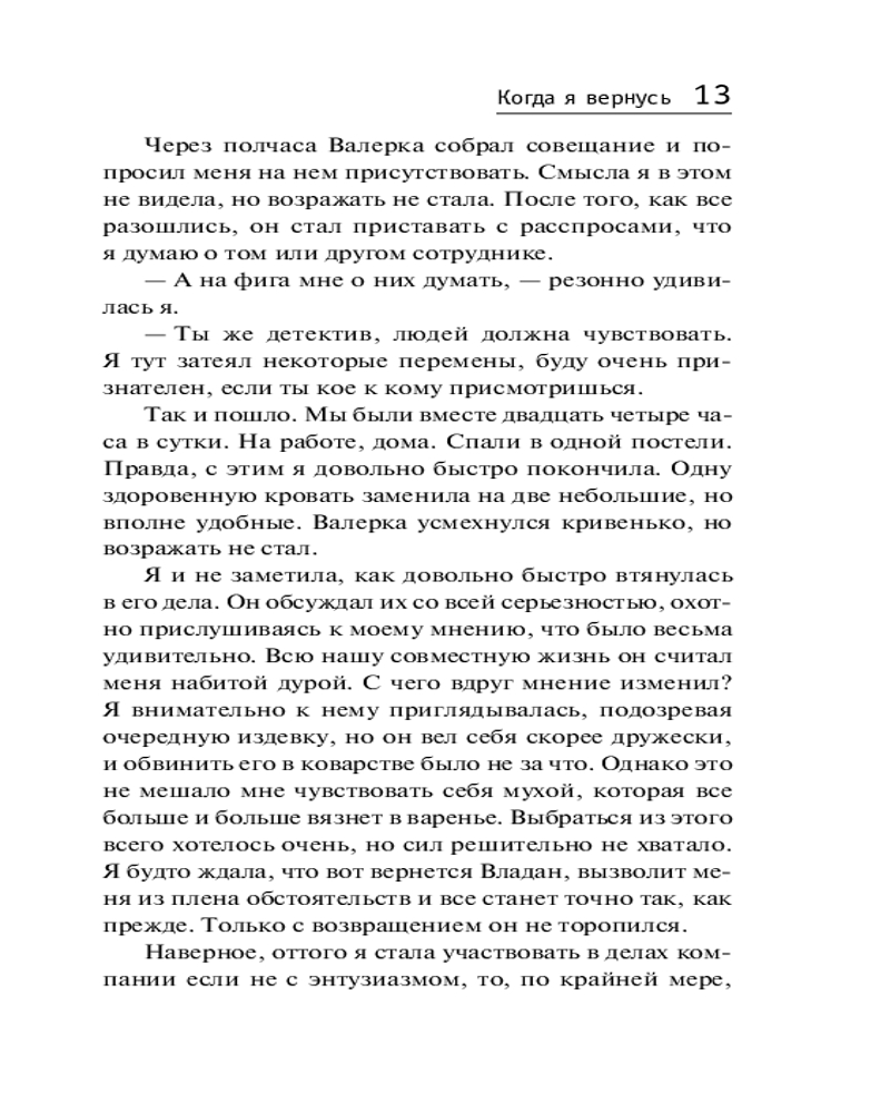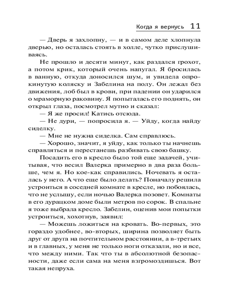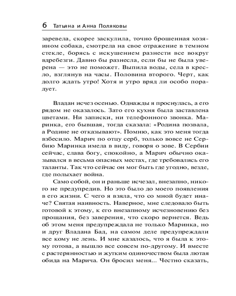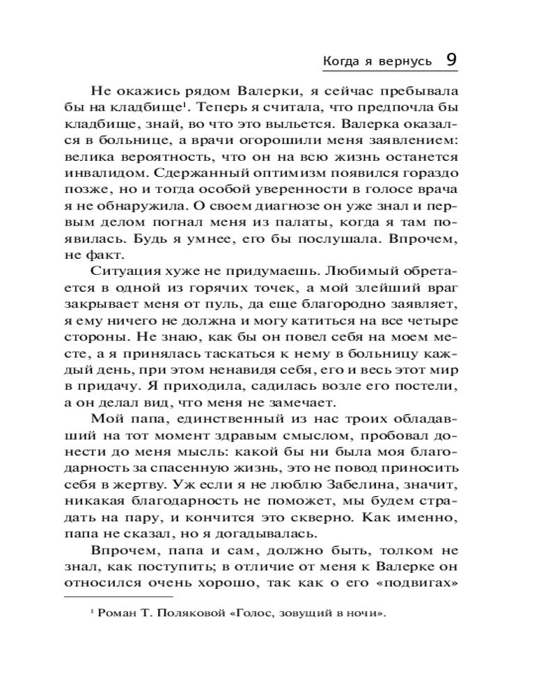 Когда я вернуськрупный шрифт читается легко переплет цена В данный момент этот товар отсутствует в продаже. Возможно, у нас найдется аналогичный или похожий товар здесь. Серия: Авантюрный детектив. Романы Т. Поляковой. Новое оформление «Когда я вернусь» — новый авантюрно-приключенческий роман из цикла «Я и Владан Марич». |
