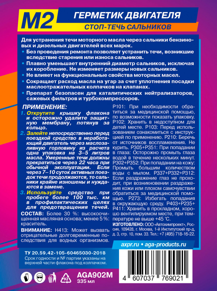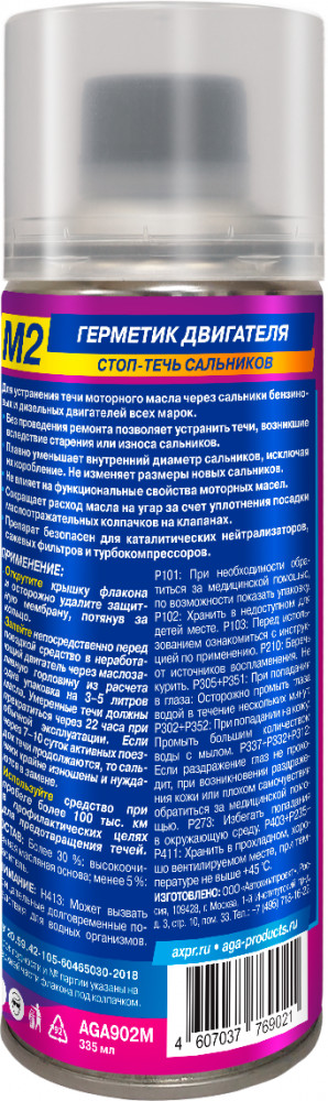 AGA Герметик двигателяВ данный момент этот товар отсутствует в продаже. Возможно, у нас найдется аналогичный или похожий товар здесь. Предназначен для устранения течи моторного масла через сальники бензиновых и дизельных двигателей всех марок. Без проведения ремонта позволяет устранить течи, возникшие вследствие старения или износа сальников. Плавно уменьшает внутренний диаметр сальников, исключая их коробление. Не изменяет размеры новых сальников. Не влияет на функциональные свойства моторных масел. Сокращает расход масла на угар за счет уплотнения посадки маслоотражательных колпачков на клапанах. Препарат безопасен для каталитических нейтрализаторов, сажевых фильтров и турбокомпрессоров. |