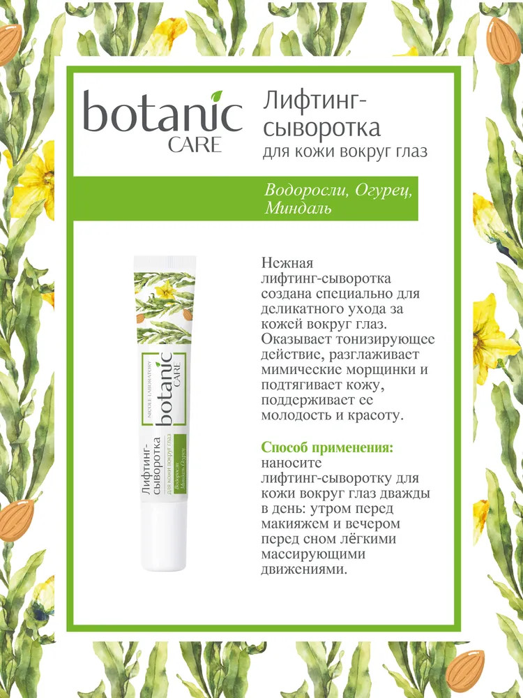 Nicole Laboratory Лифтинг-сыворотка для кожи вокруг глазлёгкая текстура быстро впитывается не липкая увлажняет В данный момент этот товар отсутствует в продаже. Возможно, у нас найдется аналогичный или похожий товар здесь. Серия: Botanic Care Омолаживающее средство для глаз лифтинг-сыворотка botanic Care увлажняет, выравнивает тон и восстанавливает упругость кожи вокруг глаз. Экстракт морских водорослей насыщает кожу полезными микроэлементами, улучшает микроциркуляцию и способствует уменьшению отеков. |