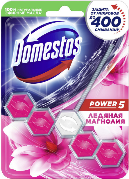 Domestos Сила 5 — пять действий, которые объединились в одном эффективном средстве для поддержания чистоты, блеска и приятного аромата в вашем туалете. Domestos Power 5 — это эффективное средство, которое содержит в себе не один, а целых пять преимуществ, обеспечивающих защиту от загрязнений, а значит и микробов. При использовании блоков Domestos Power 5 каждое смывание — заряд свежего аромата лаванды, который остается в течение длительного времени — до 4-х часов.