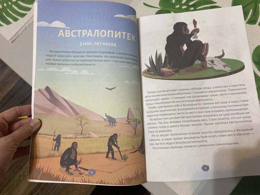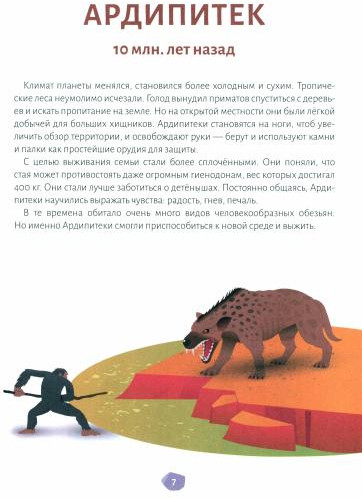 книга легко читается, детям все понятно. написано доступным языком, можно объяснить ребёнку динамику развития человека и чем отличались виды первобытных людей. идея книги очень хорошая.