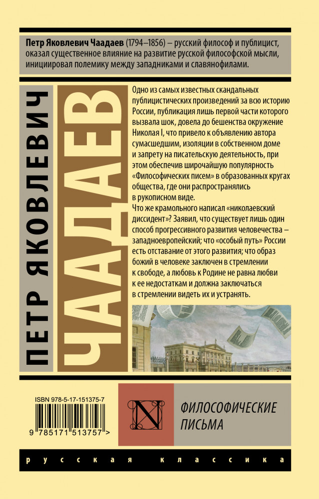 В данный момент этот товар отсутствует в продаже. Возможно, у нас найдется аналогичный или похожий товар здесь. Серия: Эксклюзив: Русская классика Одно из самых известных скандальных публицистических произведений за всю историю России, публикация лишь первой части которого вызвала шок, довела до бешенства окружение Николая I, что привело к объявлению автора сумасшедшим, изоляции в собственном доме и запрету на писательскую деятельность, при этом обеспечив широчайшую популярность «Философических писем» в образованных кругах общества, где они распространялись в рукописном виде.