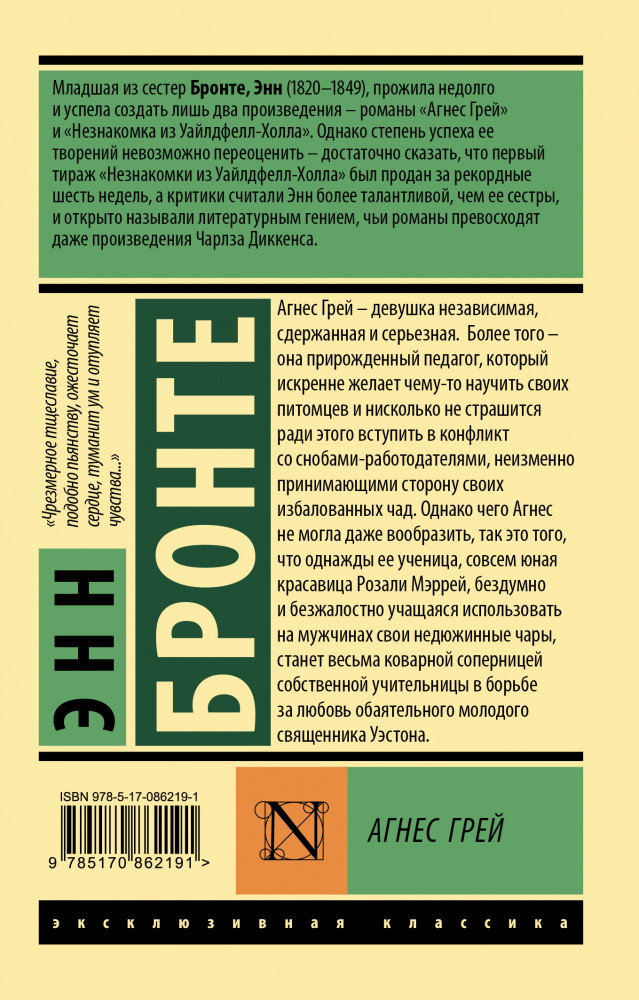 💳 Оплатить за товар можно при получении 🇰🇿 Есть бесплатная доставка по Казахстану от 1 дня 🎁 Копите бонусы с каждой покупки Серия: Эксклюзивная классика Агнес Грей — девушка независимая, сдержанная и серьезная. Более того — она прирожденный педагог, который искренне желает чему-то научить своих питомцев и нисколько не страшится ради этого вступить в конфликт со снобами-работодателями, неизменно принимающими сторону своих избалованных чад. |
