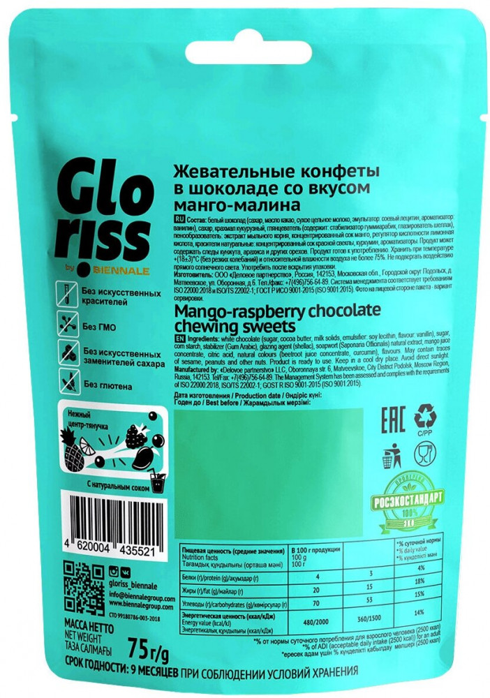 Gloriss by Biennale Конфеты жевательные в шоколаде со вкусом манго и малины «Jefrutto»
