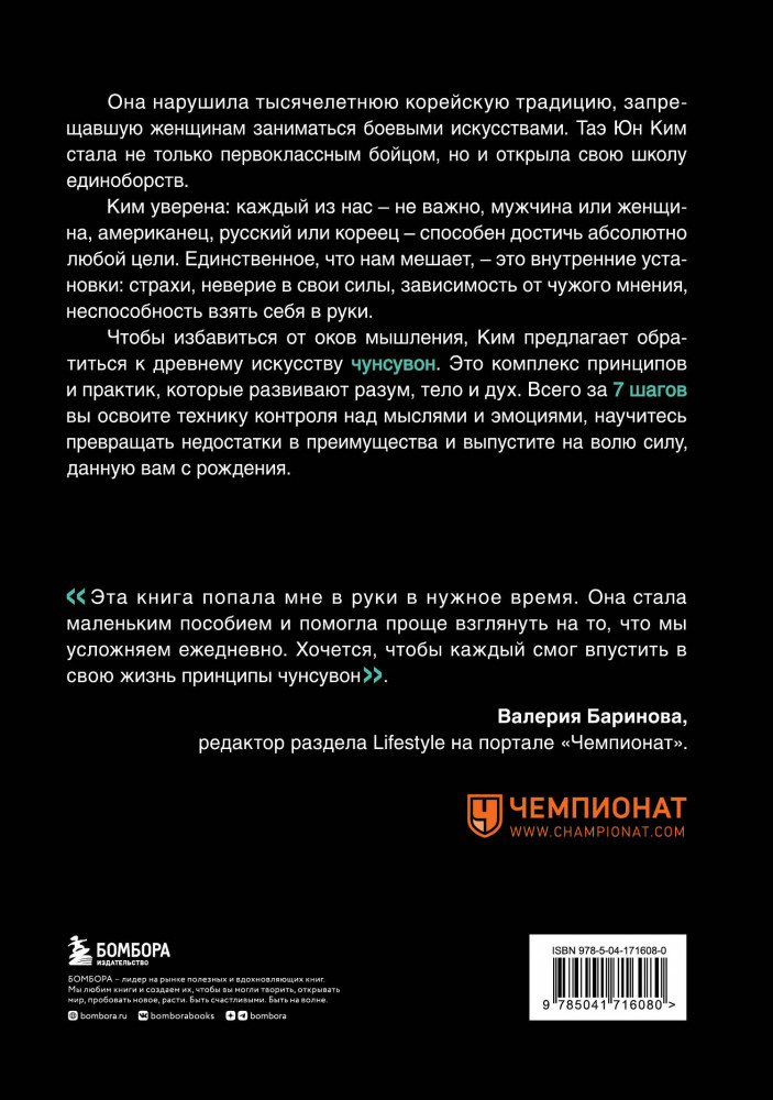 💳 Оплатить за товар можно при получении 🇰🇿 Есть бесплатная доставка по Казахстану от 1 дня 🎁 Копите бонусы с каждой покупки Серия: Книги-драйверы Когда разум захламлён суетой, тревогой и плохими мыслями — наша энергия рассеивается. Это происходит снова и снова, и мы становимся слабыми и неэффективными. Более того, в такой ситуации мы не можем быть честными с собой. Цель искусства Чунсувон — дать практические инструменты, благодаря которым вы сможете освободиться от ограничивающих, пагубных состояний ума, взглянуть на себя с разных сторон и пробудить свой невероятный потенциал к созданию жизни. |