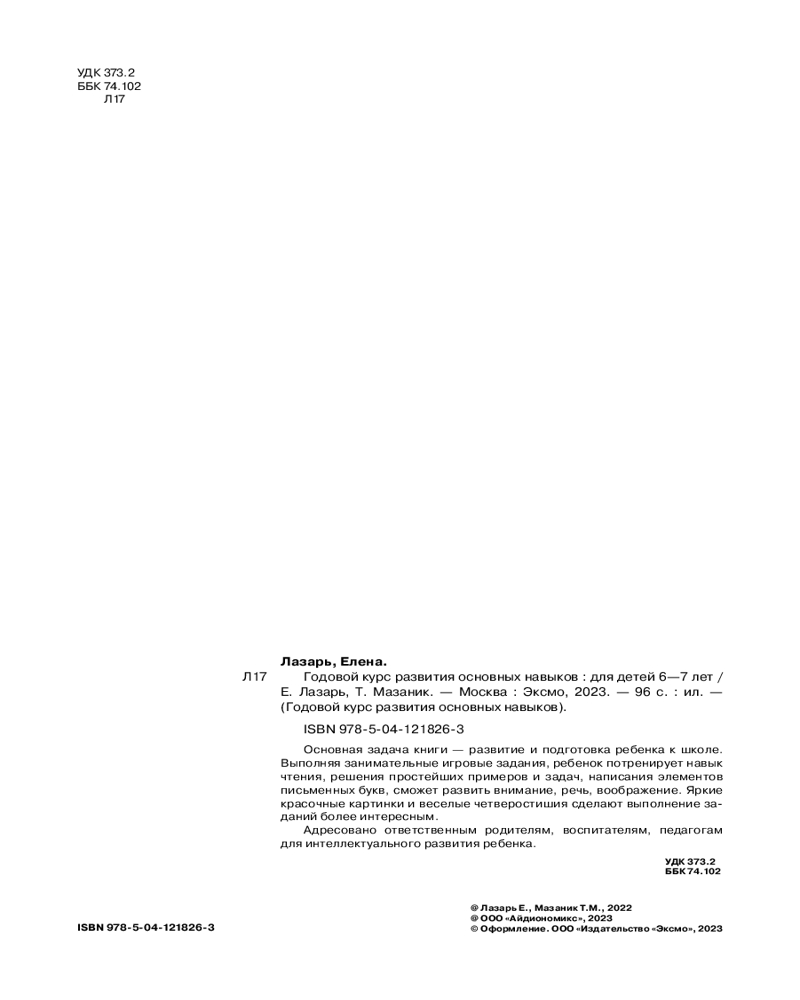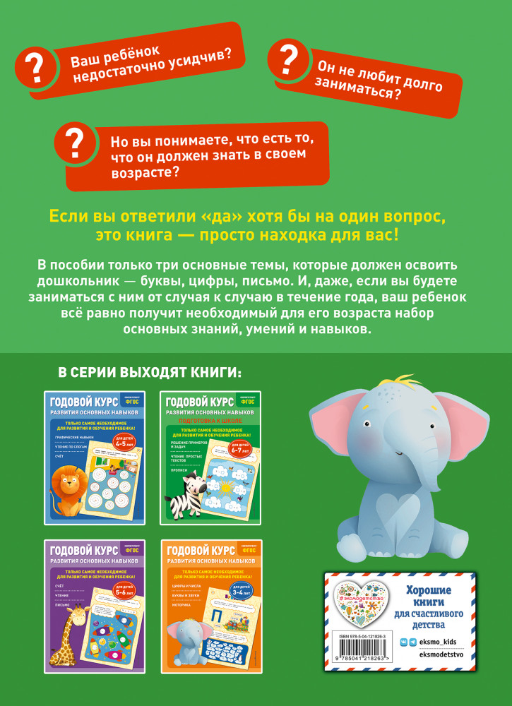 💳 Оплатить за товар можно при получении 🇰🇿 Есть бесплатная доставка по Казахстану от 1 дня 🎁 Копите бонусы с каждой покупки Серия: Годовой курс развития основных навыков Пособие разработано для повышения интеллектуального уровня дошкольника и рассчитано на год. Занимаясь, ребенок будет решать примеры и задачи на сложение и вычитание, потренирует навыки чтения слов, словосочетаний, небольших текстов, написания элементов письменных букв, расширит словарный запас и кругозор, разовьет внимание, память, речь, воображение. И тогда в дальнейшем дошкольник не будет испытывать проблем с речью, письмом, счетом, восприятием и запоминанием информации. |