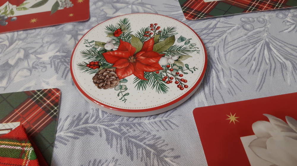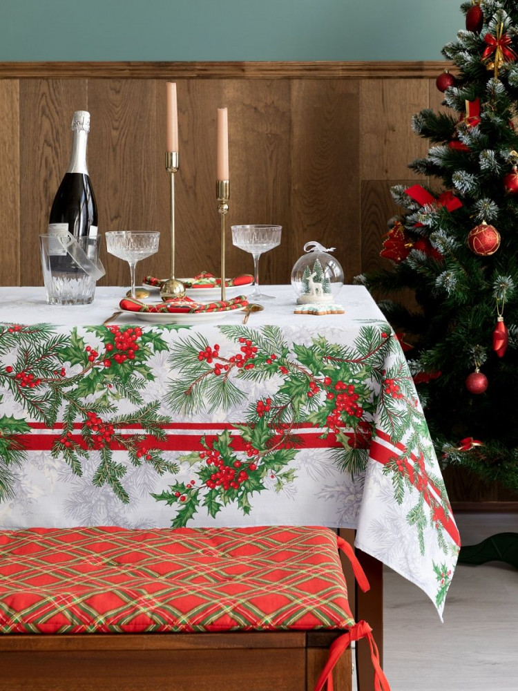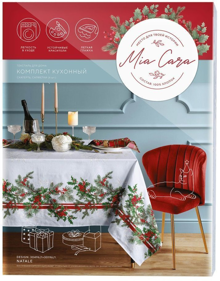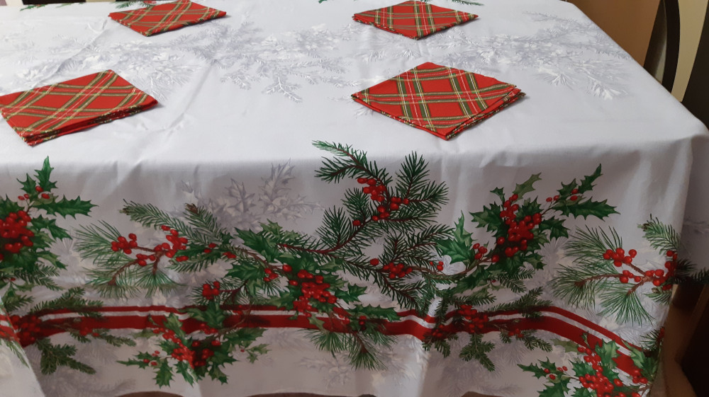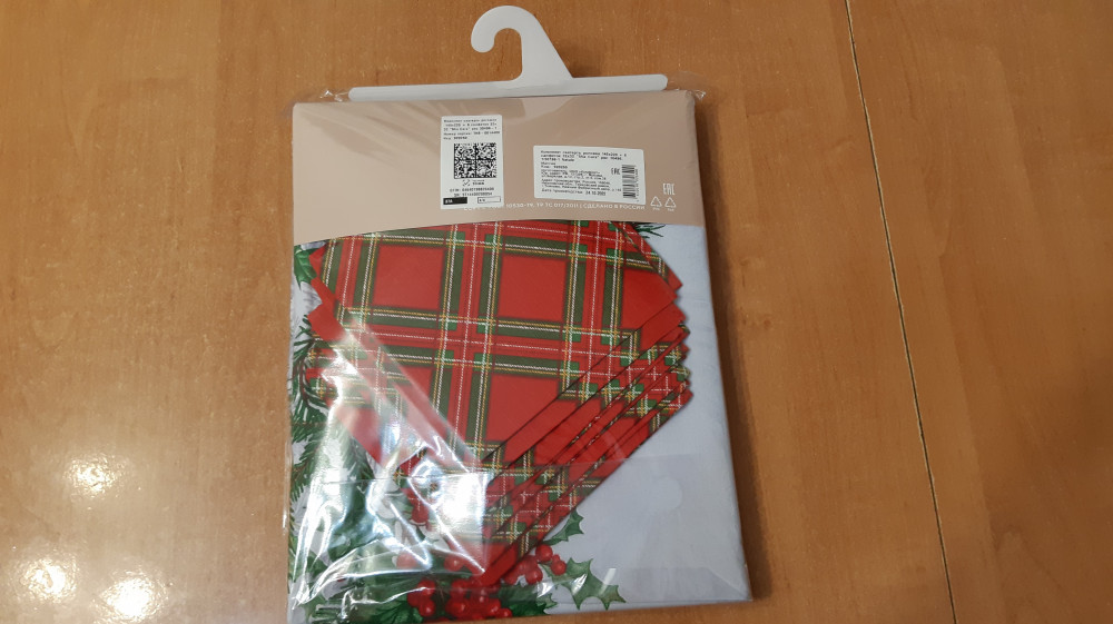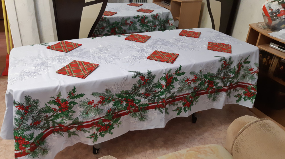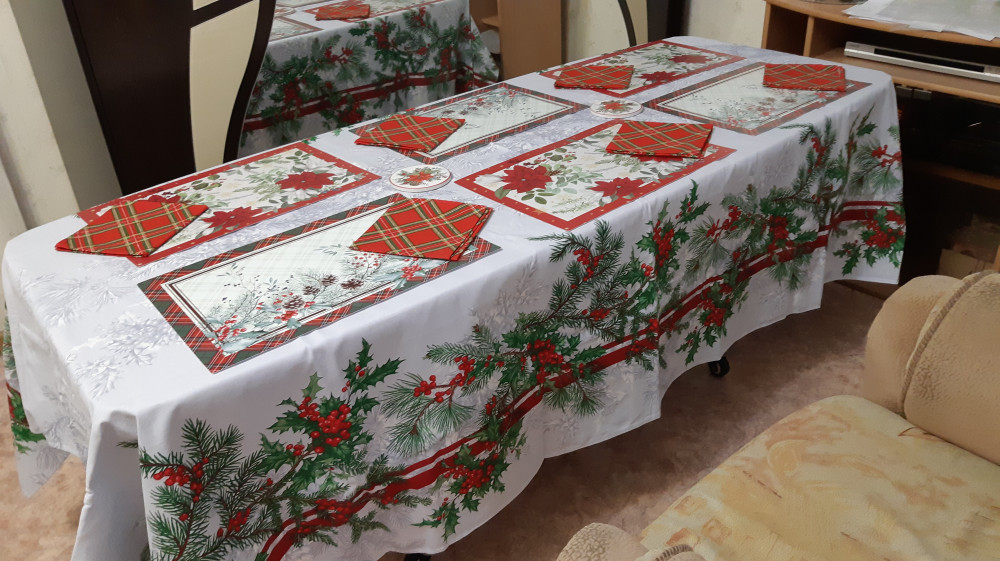 Самая красивая скатерть с салфетками! Очень рада своему приобретению. Яркая, накрахмаленная. Купила к этому набору полотенца кухонные и набор прихваток с таким же рисунком. Так же взяла подставочки под горячее керамические и пластиковые плейсматы под тарелки, салфетки со снегирями и украшения наклейки на окна. К Новогоднему празднику готовы!