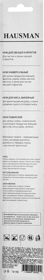 Кухонный филейный нож Hausman предназначен для отделения филе рыбы или мяса от костей и кожи, нарезания его на тонкие ломтики. Узкое полотно делает нож оптимальным инструментом для решения этих задач.
