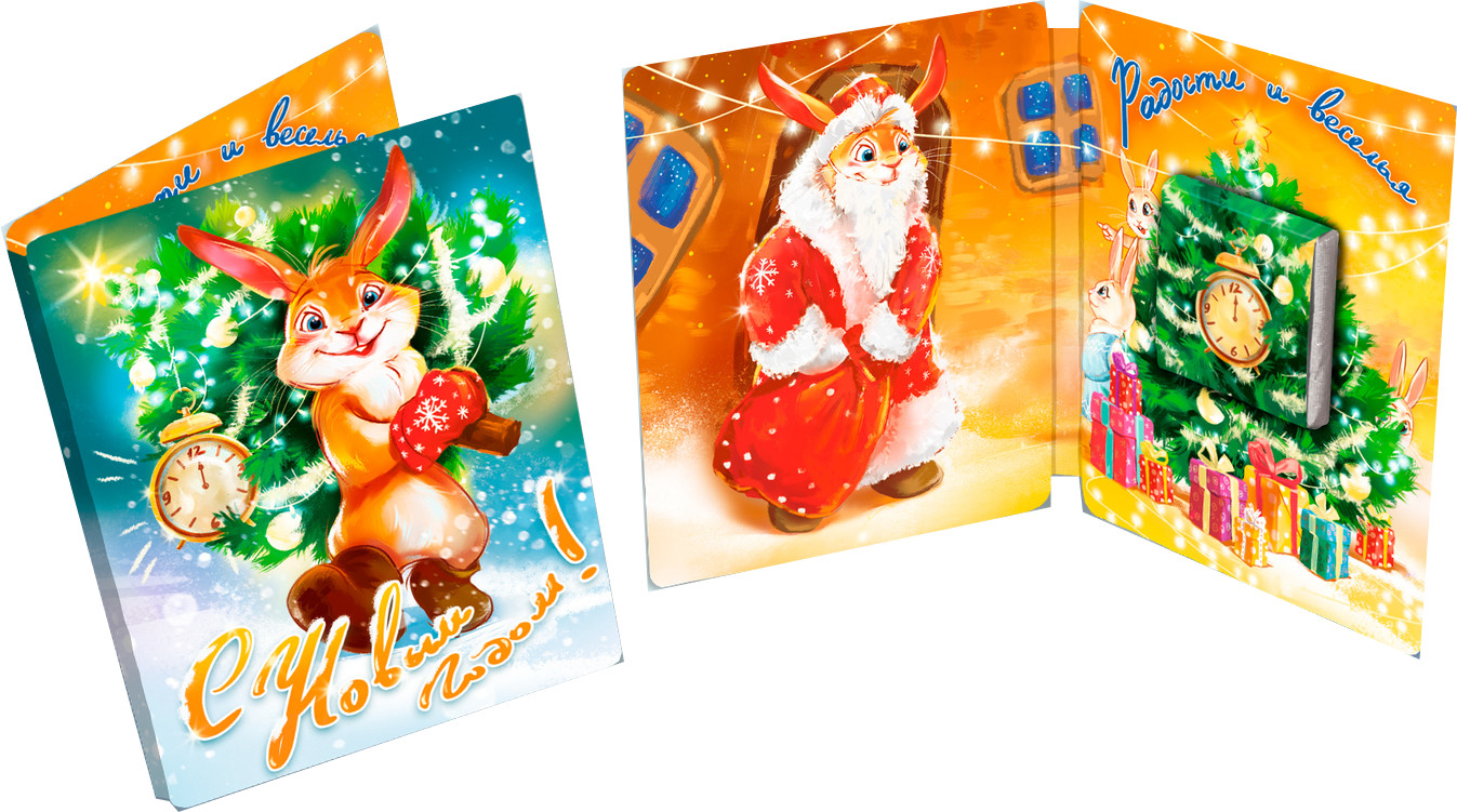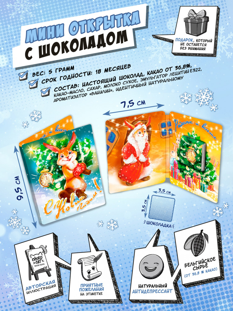 Шоколадная открытка с кроликом для новогодней радости и веселья. Мини-открытка — это отличное дополнение для букета или подарка. Способна заменить признание в любви, извинения или просто поднять настроение. Внутри молочный шоколад (5 граммов) в индивидуальной этикетке.