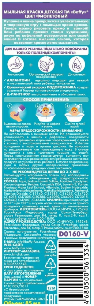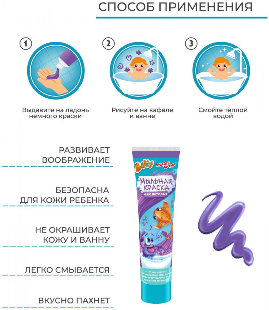 Упаковка-туба оснащена защитной мембраной подходит для использования в ванной: удобно держать, выдавливать на ладошки. У этой обновленной версии продукта более изысканные цвета и ароматы, а её полезные компоненты помогают ухаживать за нежной детской кожей. Специальный мыльный состав позволяет не только рисовать этим продуктом, но и мыться. Краска приятно пахнет и легко смывается. Не окрашивает кожу и ванну.