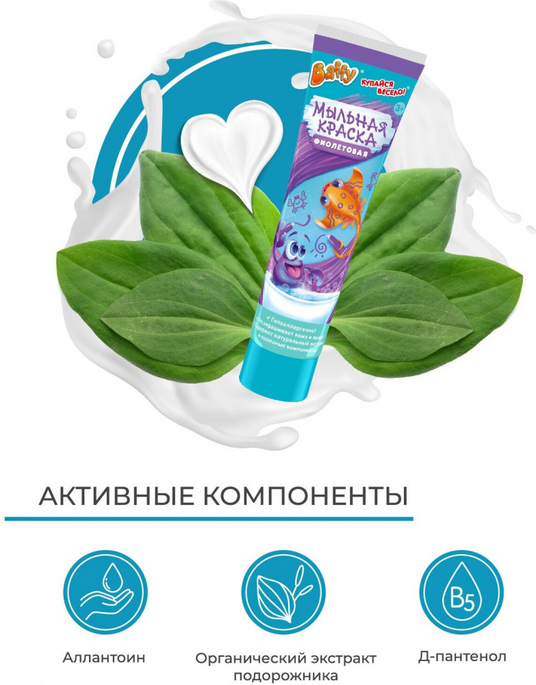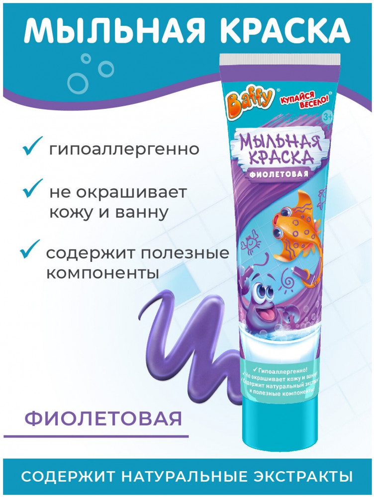 Раскройте талант художника в вашем ребёнке с новой мыльной краской Baffy. Купаться и рисовать одновременно — очень весело! Наносить можно на тело, кафель, сантехнику и куда угодно. Любой будет в восторге! Рисование пальцами развивает мелкую моторику ручек ребёнка, фантазию и воображение. В состав мыльной краски добавлены натуральный экстракт и полезные компоненты, которые помогут заботиться о коже малыша: аллантоин, органический экстракт подорожника, д-пантенол.