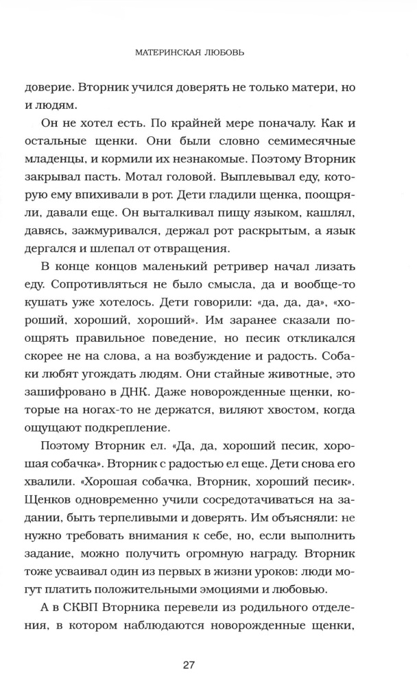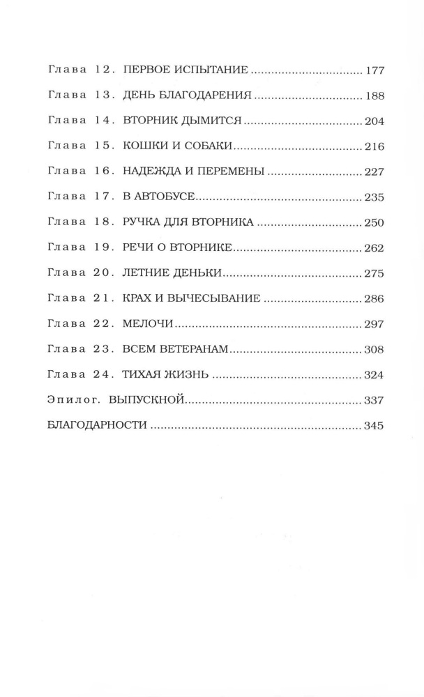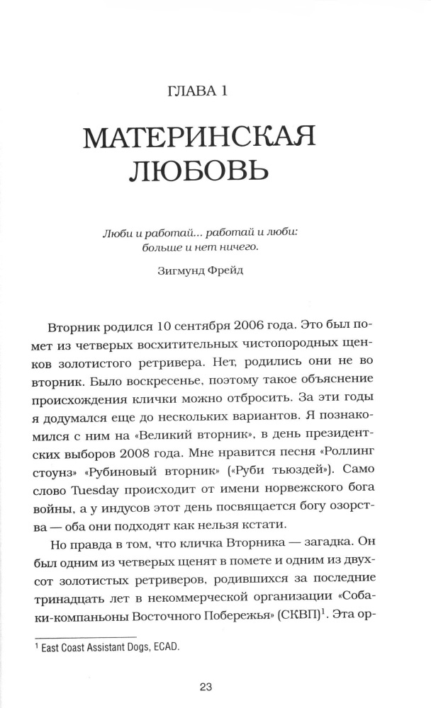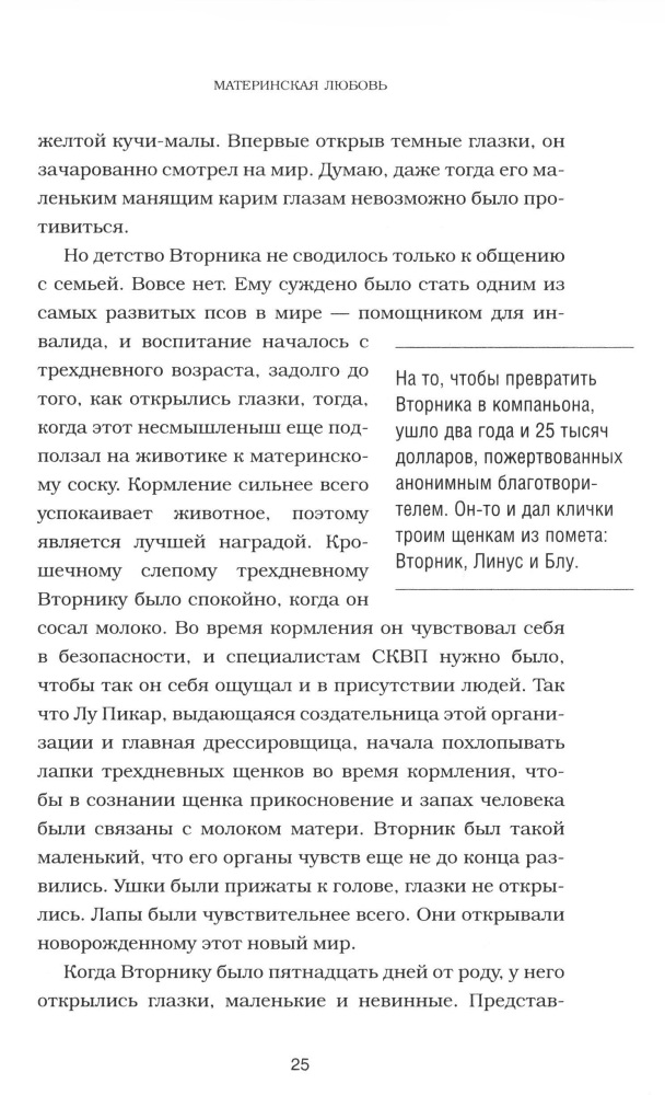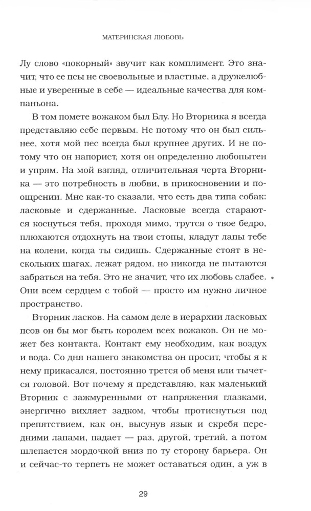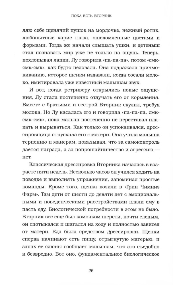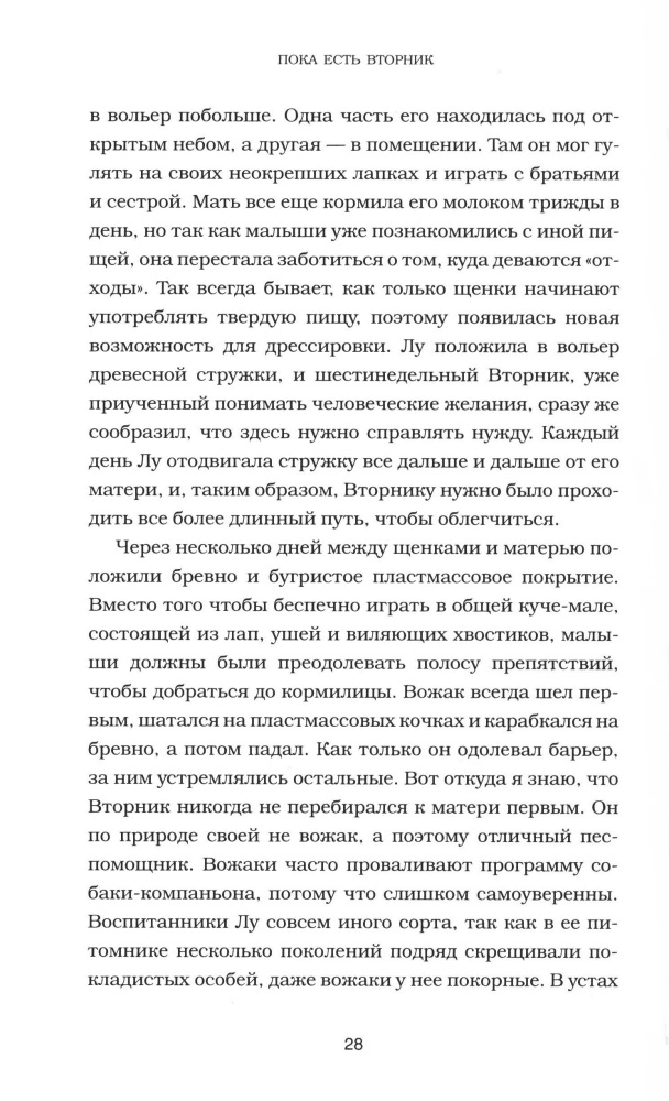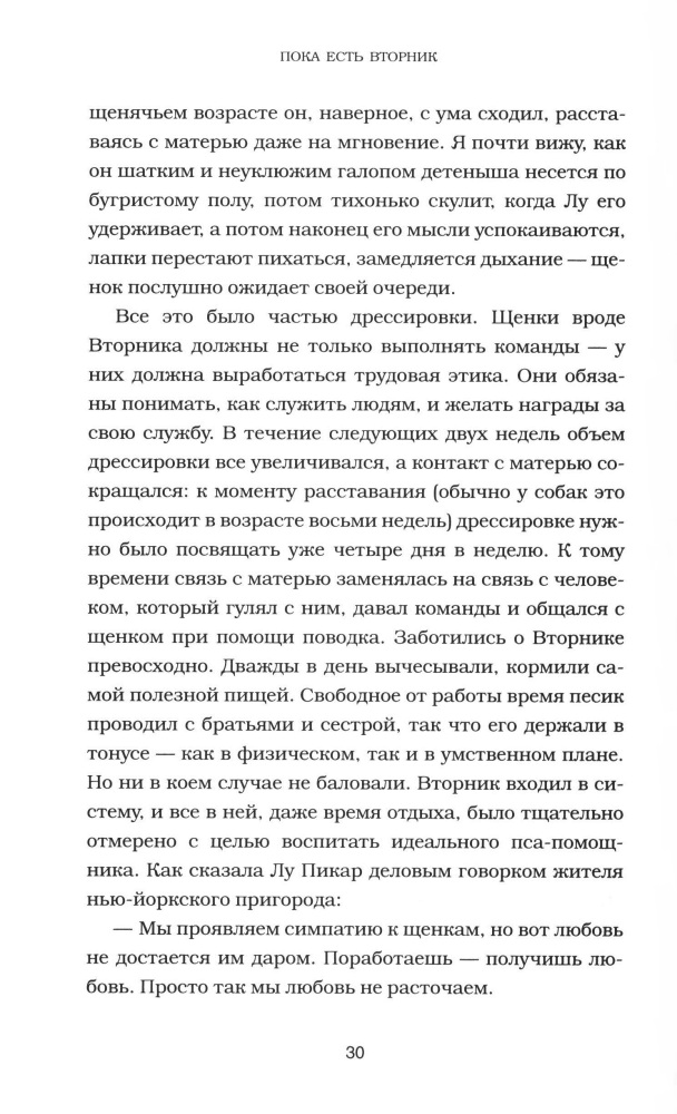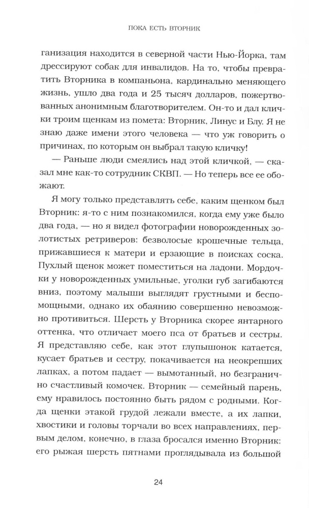 Это не просто история о человеке и собаке. О человеке, который прошел все муки войны, был ранен и получил психологические травмы, гораздо серьезнее, чем физические. О собаке, для которой этот человек стал миром, и которому она подарила всю ласку, тепло и любовь. Эта книга о той неразрывной связи, возникающей между любящими друг друга. О том, что удерживает человека в этом мире. При чтении этой книги невозможно удержаться от слез, когда читаешь о том, что несла с собой война, и как страдали люди, которые в ней побывали. Невозможно не рассмеяться при описании невинных проделок и шалостей, которые вытворял Вторник. Умиляешься тем чувствам, которые научились выражать и делиться друг с другом человек и пес. Нужно, чтобы у каждого было такое существо, дарящее любовь и дружбу...
