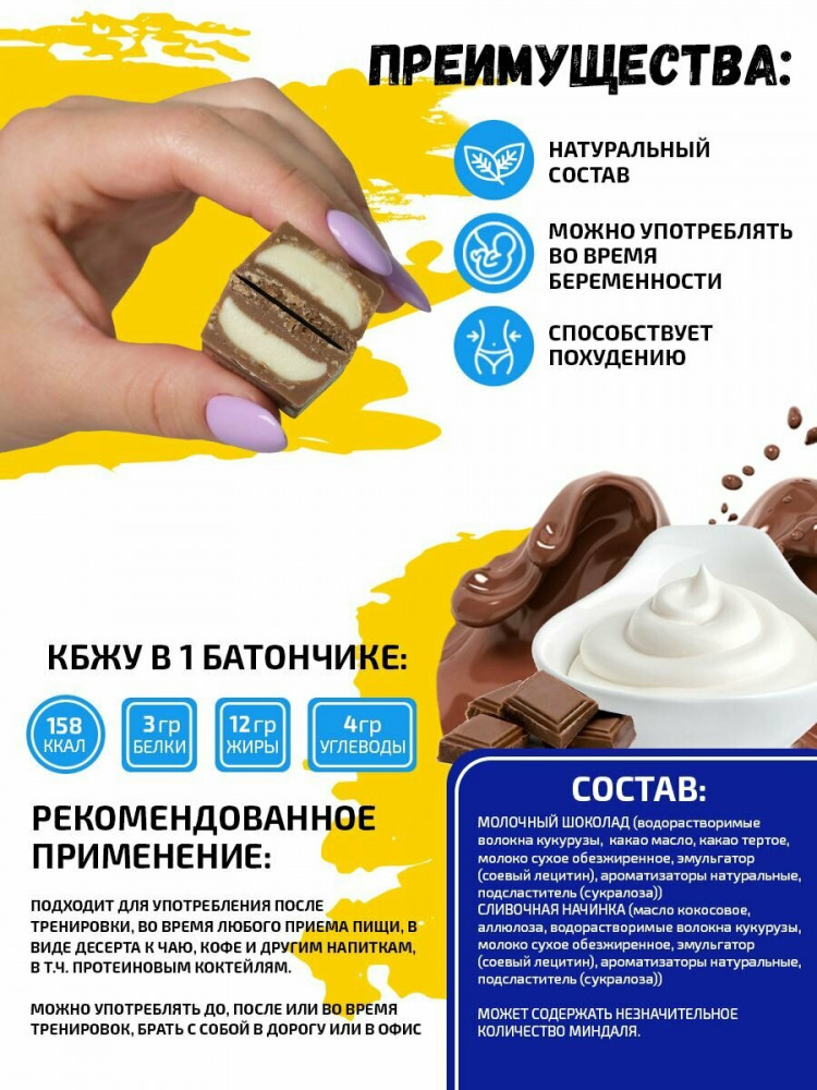 Купила для дочери, ей понравился, пишу отзыв с ее слов, -"Вкусный, нежный батончик, буквально тает во рту. Как хорошо, что такие выпускают для тех кто не может без сладкого, но не употребляет сахар". К сожалению эндокринолог не советует мне такие есть, хотя они и без сахара, но влияют на подъем глюкозы в крови, у меня диабет. Это не диабетический продукт.