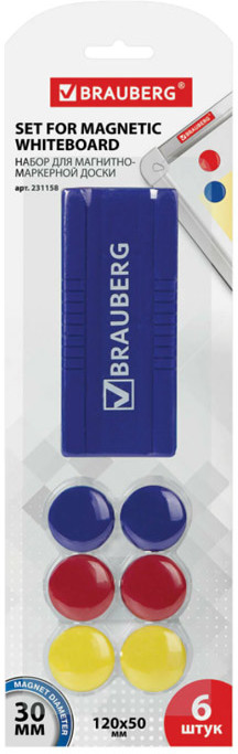 💳 Оплатить за товар можно при получении 🇰🇿 Есть бесплатная доставка по Казахстану от 1 дня 🎁 Копите бонусы с каждой покупки Набор принадлежностей для магнитно-маркерной доски Brauberg предназначен для офиса и дома. В составе набора: магнитный стиратель, 6 разноцветных магнитов. Стиратель имеет эргономичную форму, поэтому его удобно дерджать в руке. Фетровый слой хорошо стирает следы от маркера с доски. При помощи встроенного магнита стиратель крепится к доске. Магниты ярких цветов с диаметром 6 мм отлично держат бумагу. |