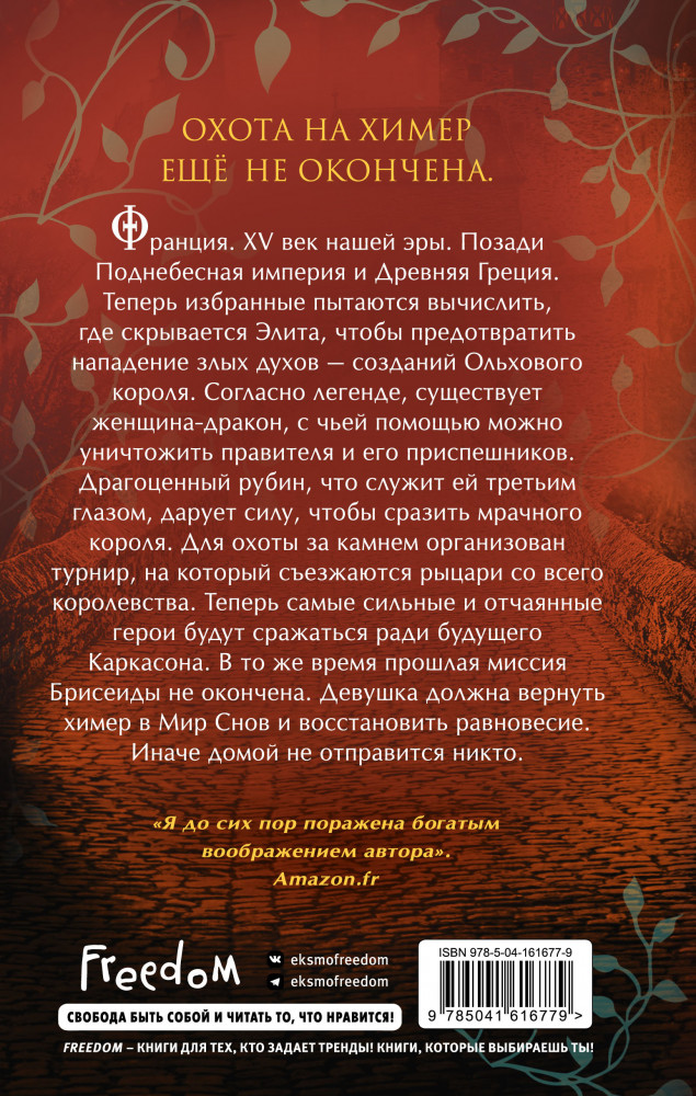 В данный момент этот товар отсутствует в продаже. Возможно, у нас найдется аналогичный или похожий товар здесь. Серия: Young Adult. Брисеида Франция. XV век нашей эры. Позади Поднебесная империя и Древняя Греция. Теперь избранные пытаются вычислить, где скрывается Элита, чтобы предотвратить нападение злых духов — созданий Ольхового короля. Согласно легенде, существует женщина-дракон, с чьей помощью можно уничтожить правителя и его приспешников. Драгоценный рубин, что служит ей третьим глазом, дарует силу, чтобы сразить мрачного короля. Для охоты за камнем организован турнир, на который съезжаются рыцари со всего королевства. Теперь самые сильные и отчаянные герои будут сражаться ради будущего Каркасона. В то же время, прошлая миссия Брисеиды не окончена. Девушка должна вернуть химер в Мир Снов и восстановить равновесие. Иначе домой не отправится никто. |