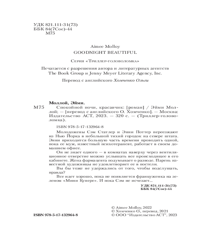 💳 Оплатить за товар можно при получении 🇰🇿 Есть бесплатная доставка по Казахстану 🎁 Копите бонусы с каждой покупки Серия: Триллер. Головоломка Молодожены Сэм Статлер и Энни Поттер переезжают из Нью Йорка в небольшой тихий городок на севере штата. |